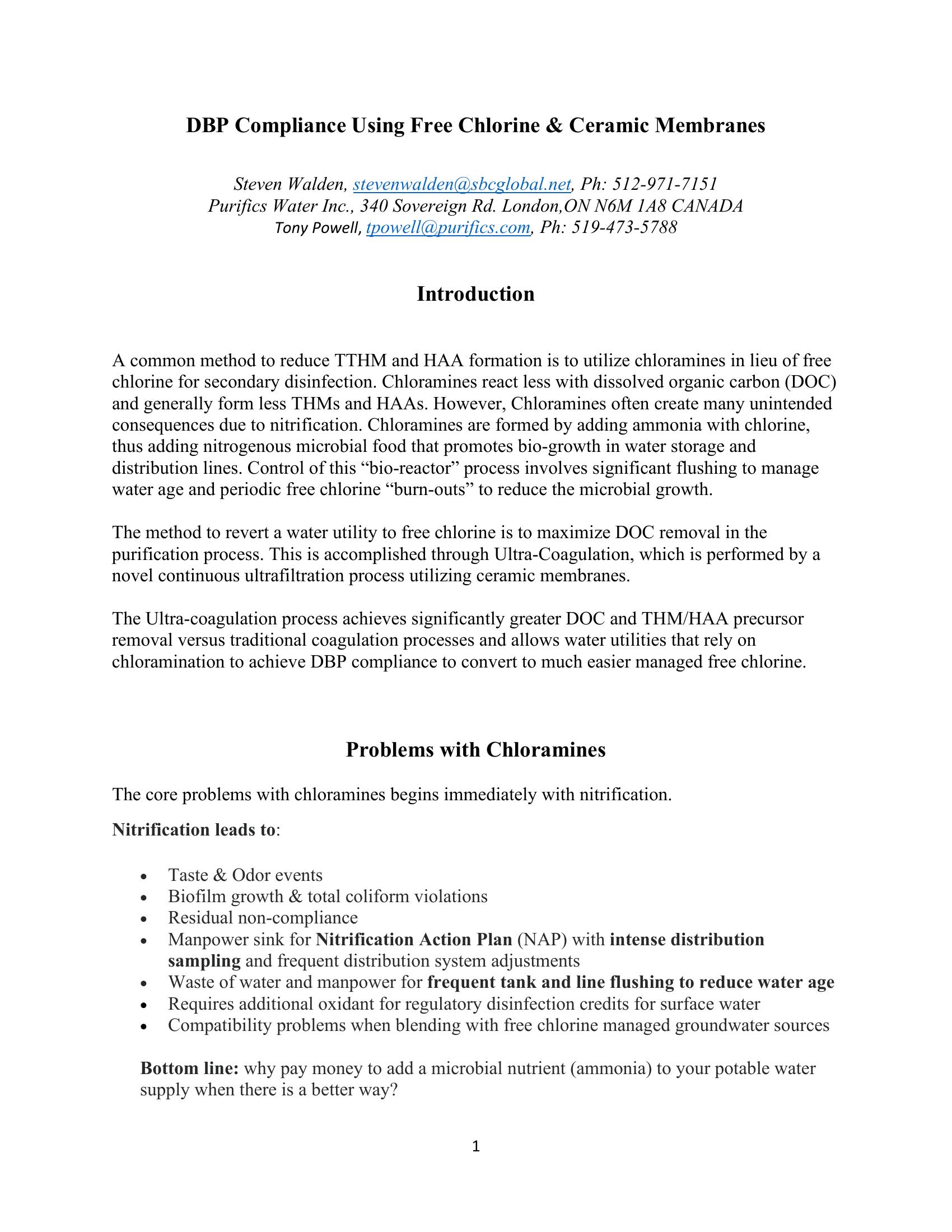 A common method to reduce TTHM and HAA formation is to utilize chloramines in lieu of free chlorine for secondary disinfection. Chloramines react less with dissolved organic carbon (DOC) and generally form less THMs and HAAs. However, Chloramines often create many unintended consequences due to nitrification. Chloramines are formed by adding ammonia with chlorine, thus adding nitrogenous microbial food that promotes bio-growth in water storage and distribution lines. Control of this ìbio-reactorî process involves significant flushing to manage water age and periodic free chlorine ìburn-outsî to reduce the microbial growth. The method to revert a water utility to free chlorine is to maximize DOC removal in the purification process. This is accomplished through Ultra-Coagulation, which is performed by a novel continuous ultrafiltration process utilizing ceramic membranes. The Ultra-coagulation process achieves significantly greater DOC and THM/HAA precursor removal versus traditional coagulation processes and allows water utilities that rely on chloramination to achieve DBP compliance to convert to much easier managed free chlorine.
