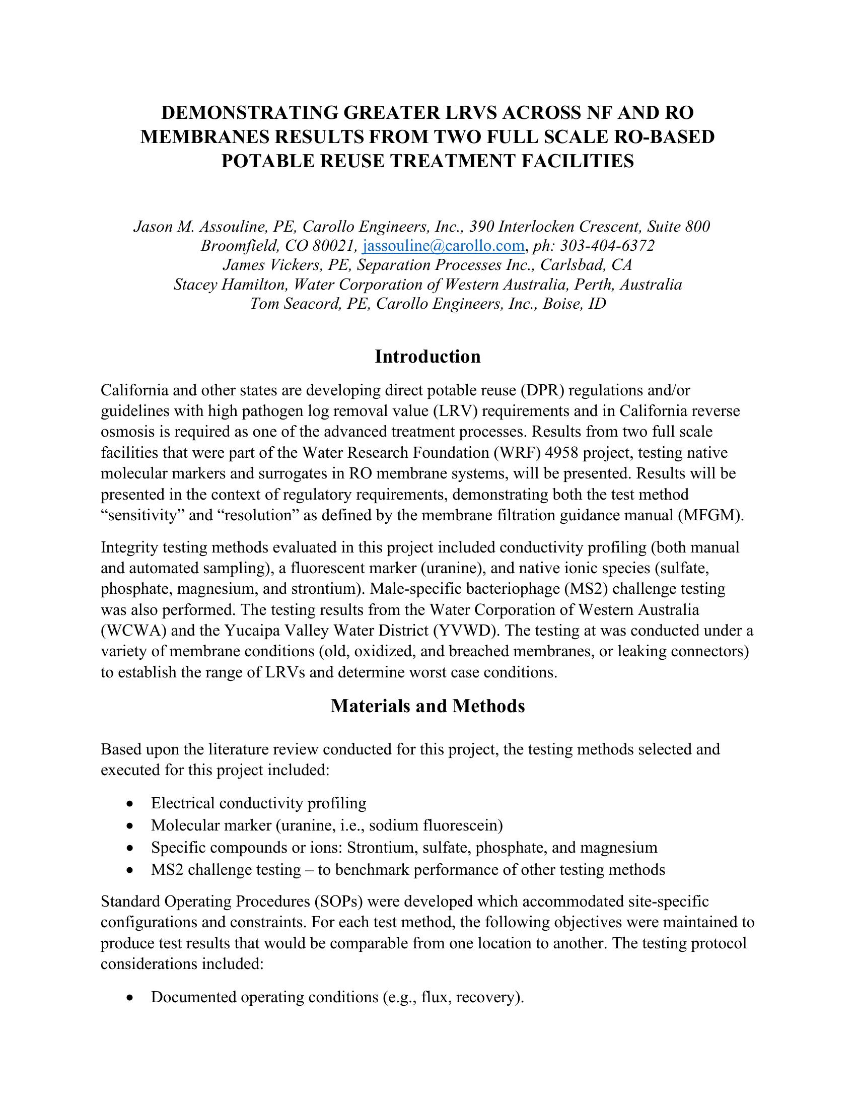 California and other states are developing direct potable reuse (DPR) regulations and/or guidelines with high pathogen log removal value (LRV) requirements and in California reverse osmosis is required as one of the advanced treatment processes. Results from two full scale facilities that were part of the Water Research Foundation (WRF) 4958 project, testing native molecular markers and surrogates in RO membrane systems, will be presented. Results will be presented in the context of regulatory requirements, demonstrating both the test method ìsensitivityî and ìresolutionî as defined by the membrane filtration guidance manual (MFGM). Integrity testing methods evaluated in this project included conductivity profiling (both manual and automated sampling), a fluorescent marker (uranine), and native ionic species (sulfate, phosphate, magnesium, and strontium). Male-specific bacteriophage (MS2) challenge testing was also performed. The testing results from the Water Corporation of Western Australia (WCWA) and the Yucaipa Valley Water District (YVWD). The testing at was conducted under a variety of membrane conditions (old, oxidized, and breached membranes, or leaking connectors) to establish the range of LRVs and determine worst case conditions.