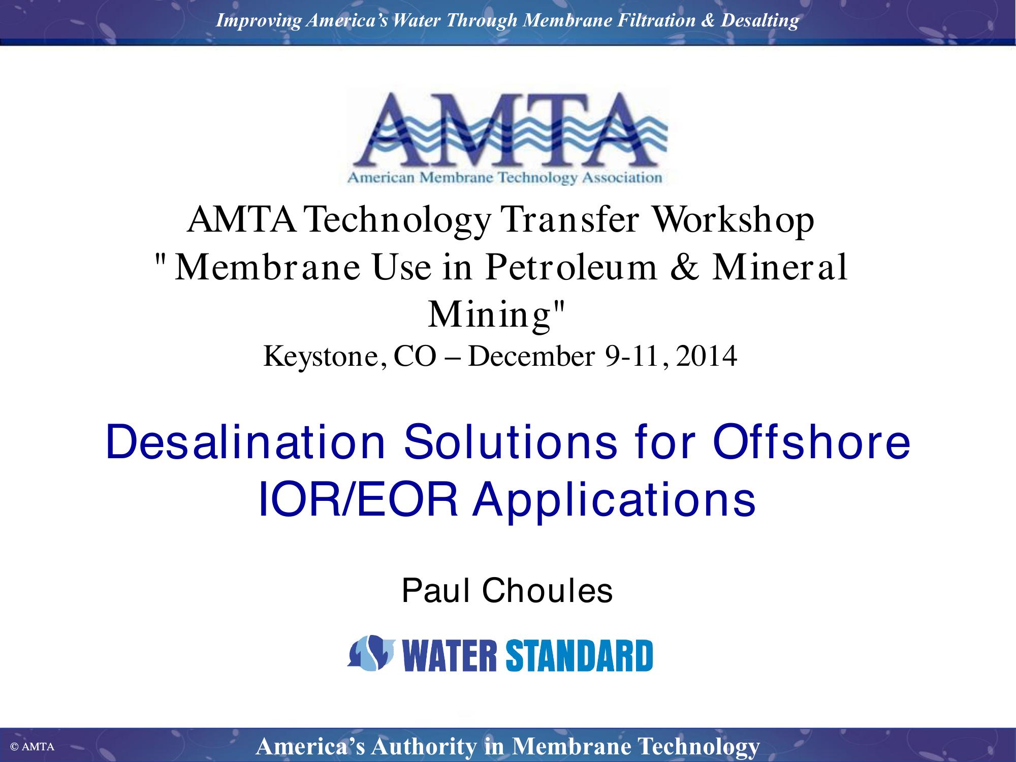Discusses uses of membranes in offshore oil production and key issues associted with their use. Weight reduction and footprint reduction are critical for any offshore water treatment process. Various membrane based processes discussed, including membrane filtration, low salinity waterflooding, and membrane deaeration.
