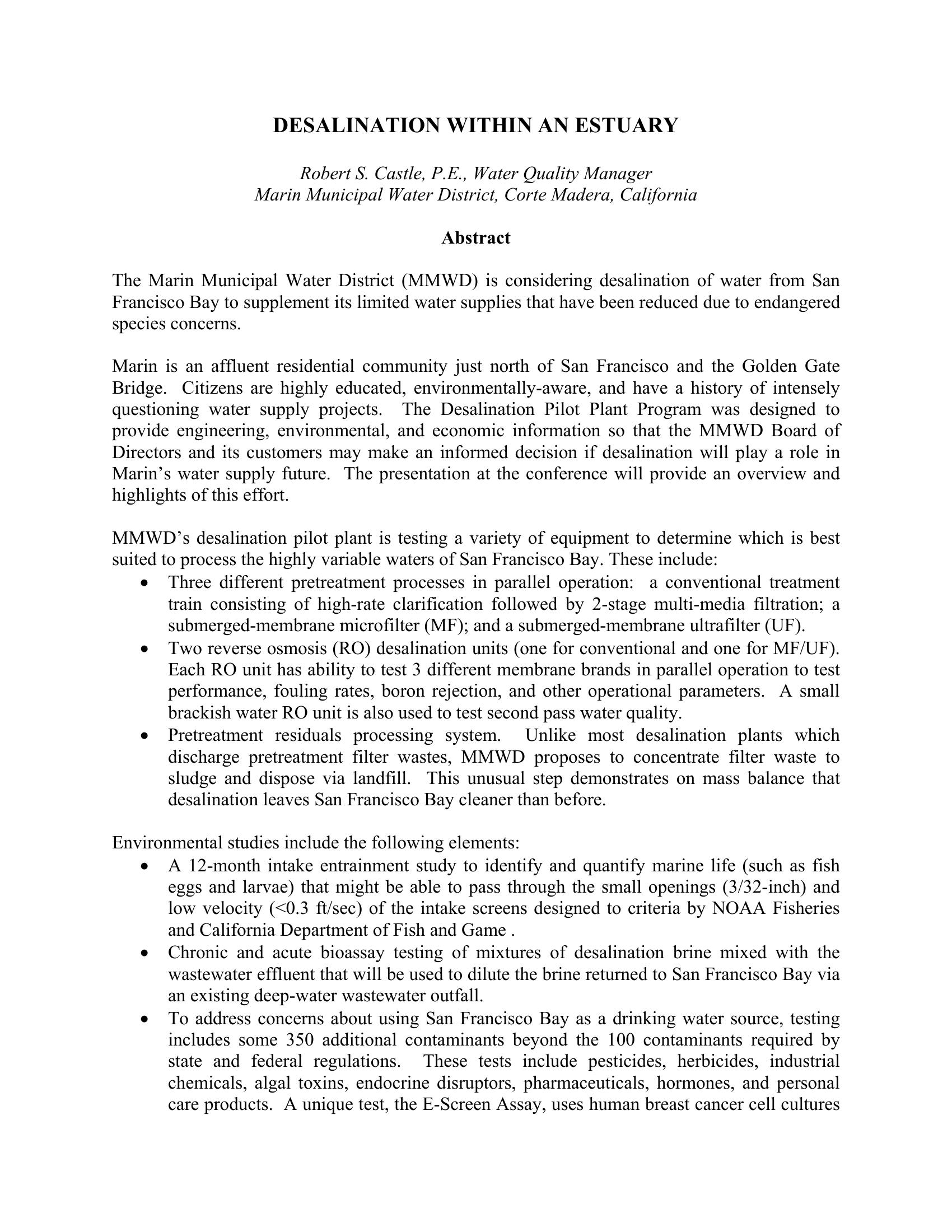 Desalination within an Estuary Drinking Water from San Francisco Bay