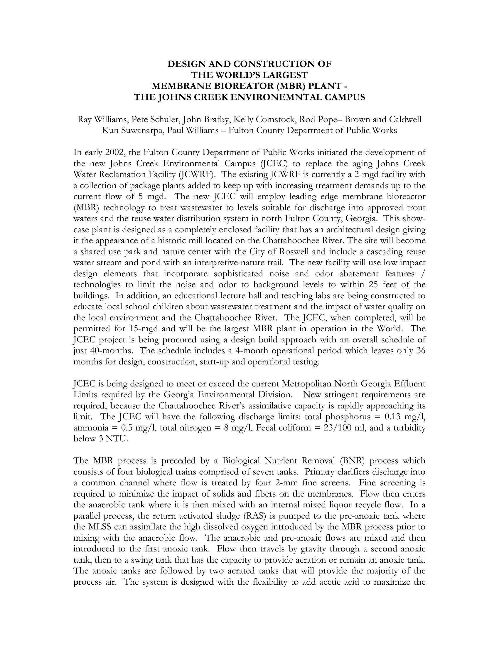 The paper and presentation will describe the MBR process at the JCEC and it’s impact on the surrounding community and environment. In 2002-2003, the Metropolitan North Georgia Water Planning District Act was adopted to curtail anticipated water shortages, which could ultimately inhibit economic growth. This act required water reuse system development and water plans for the 16-county metropolitan area. Georgia EPD set a goal of 10% recycled effluent for the North Georgia service areas. Georgia EPD also issued the Guidelines for Water Reclamation and Urban Water Reuse in February 2002 to aid the design community in developing details and plans for future studies and projects. By mid-2003, Fulton County through a public/private partnership had completed its first major membrane plant, the Cauley Creek Water Reclamation Facility (WRF), which allowed a building moratorium to be relaxed. The facility currently treats 5 mgd of wastewater and distributes approximately 75% as reuse quality water to the local communities during peak summer months. The JCEC allows Fulton County to continue to lead the region’s water reuse effort and to enlarge the North Fulton County reuse distribution system.
