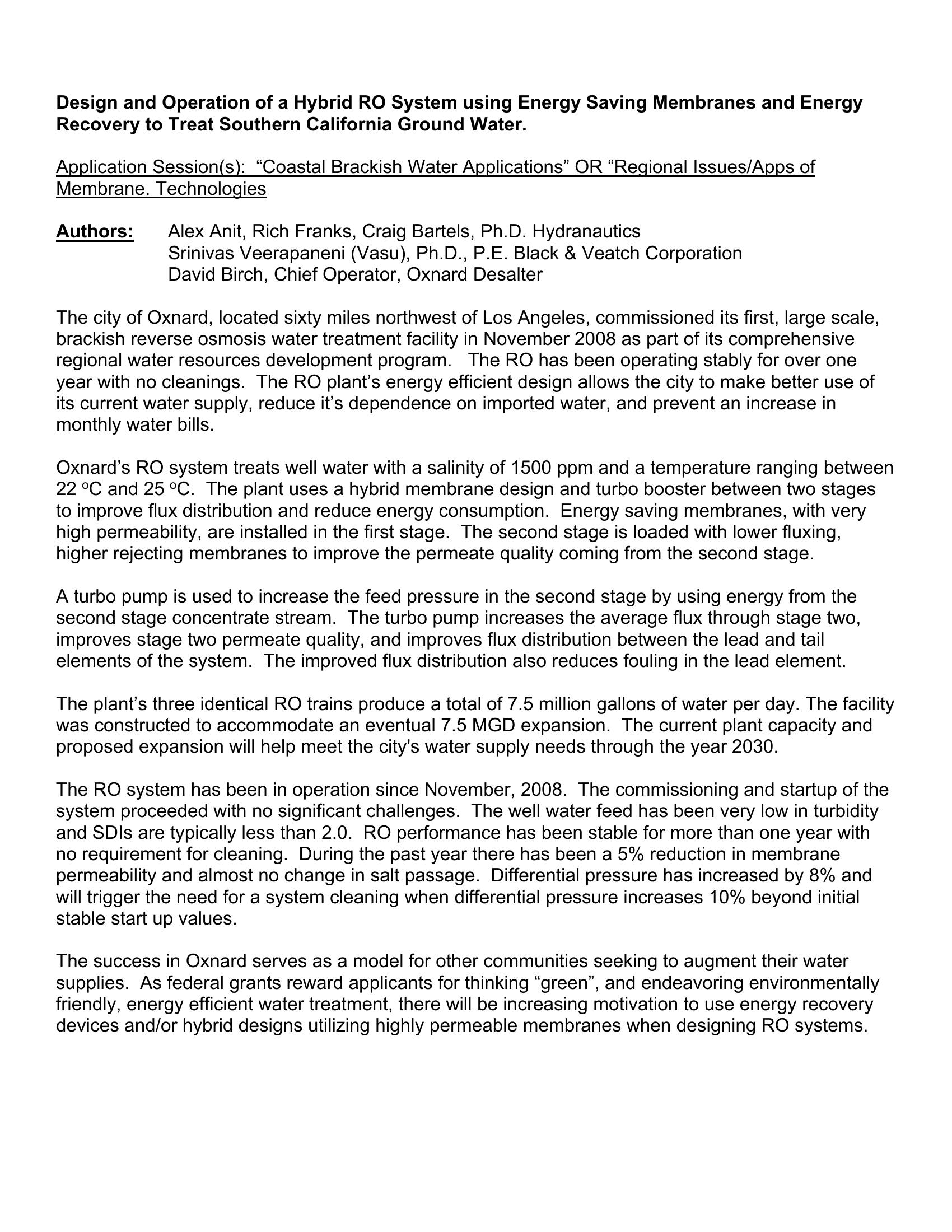 The successful use of a hybrid membrane design and turbo booster at the City of Oxnard, CA is presented. The first stage of the system has high permeable energy saving membranes, whild the second stage has lower permeable higher rejecting membranes. The turbo pump optimizes the overall energy performance of the system.