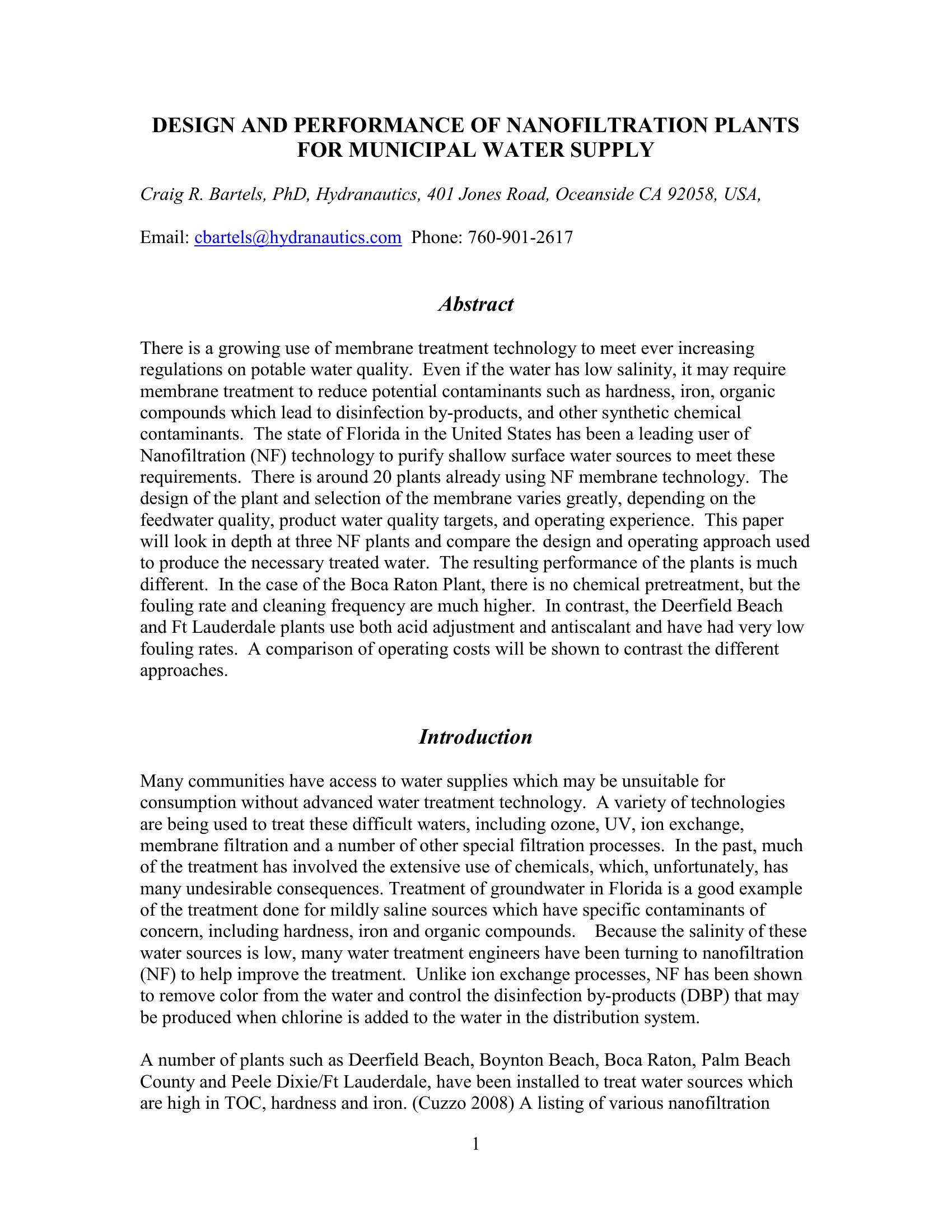 Design and performance of Nanofiltration Plants for Municipal Water Supply