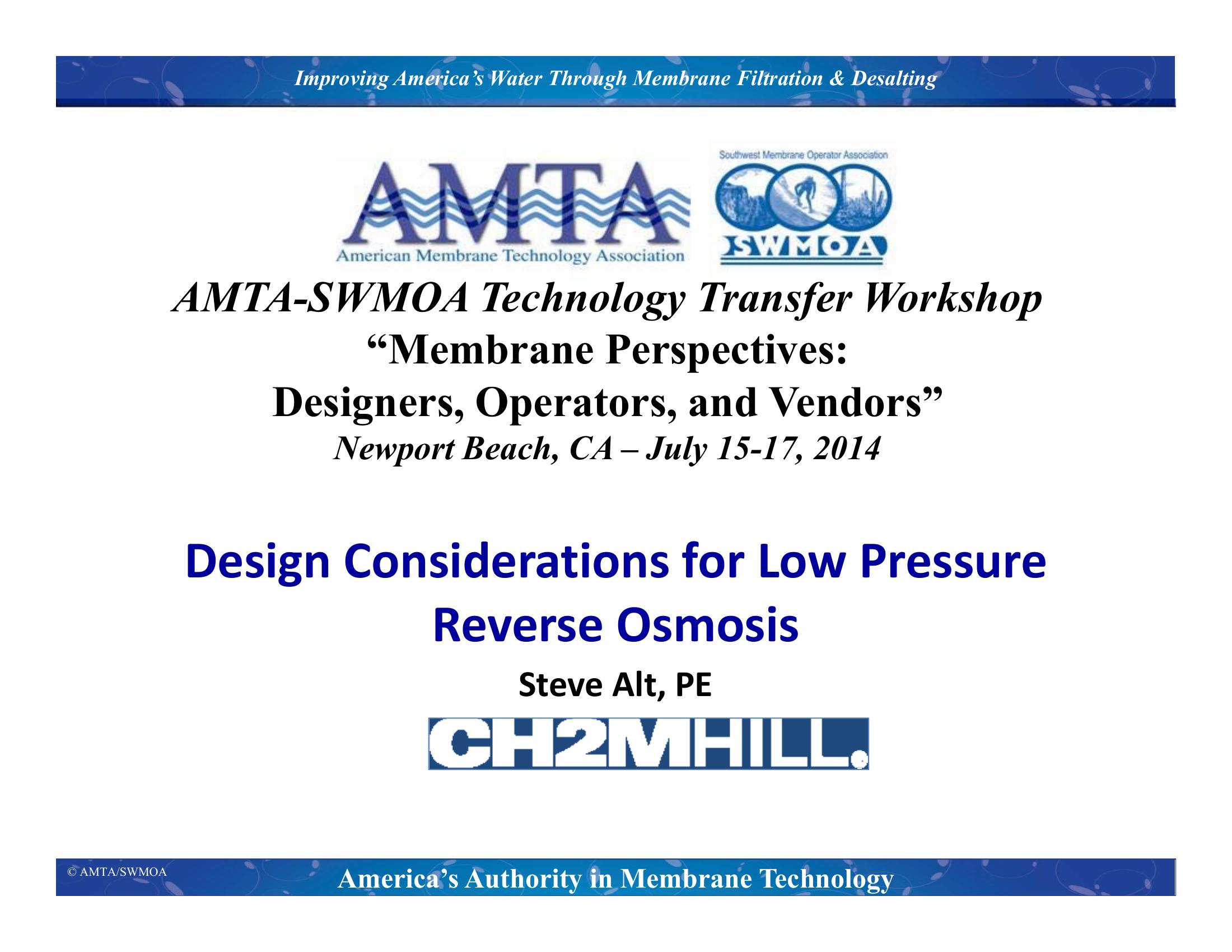 This presentation provides design considerations for low pressure reverse osmosis (RO) systems. Topics discussed include pretreatment, membrane selection, chemical cleaning, piping configurations, energy recovery, and flux balancing. The presentation concludes with a case study documenting the Camp Pendleton RO system design.