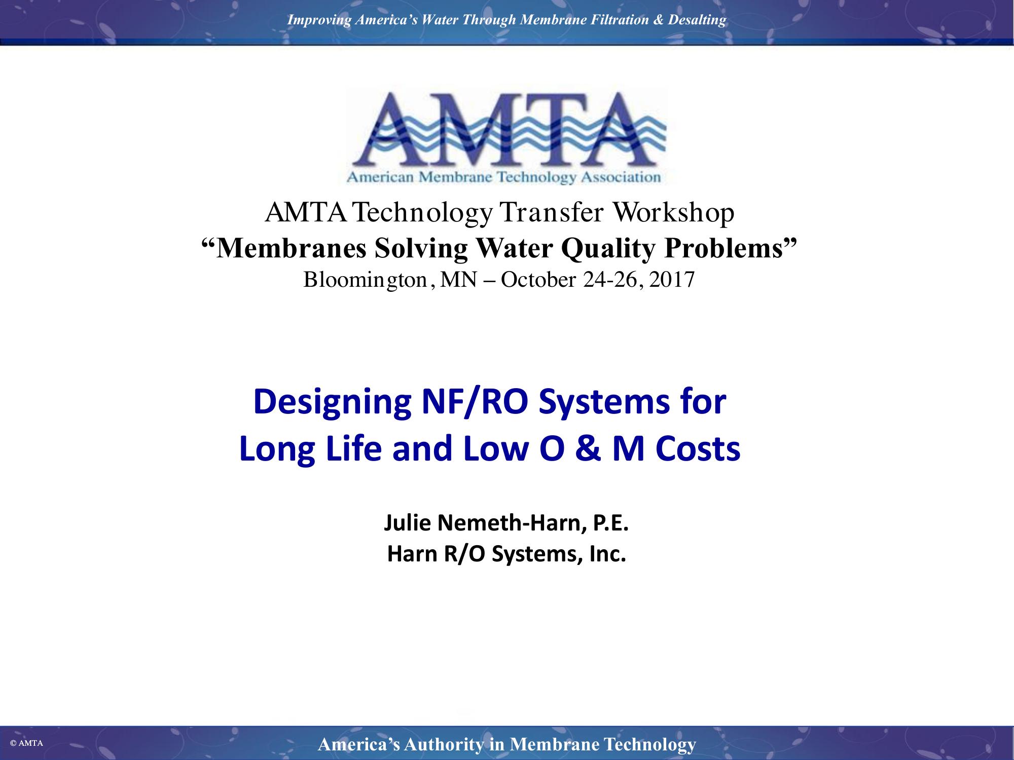 This presentation will present guidelines for good basic design parameters for membrane treatment systems including hydraulics and energy efficiency. Detailed information on component selection and materials of construction evaluation will be provided for the membrane process and related ancillary components such as cartridge filters, pumps, cleaning system, chemical feed systems, valves and instruments.