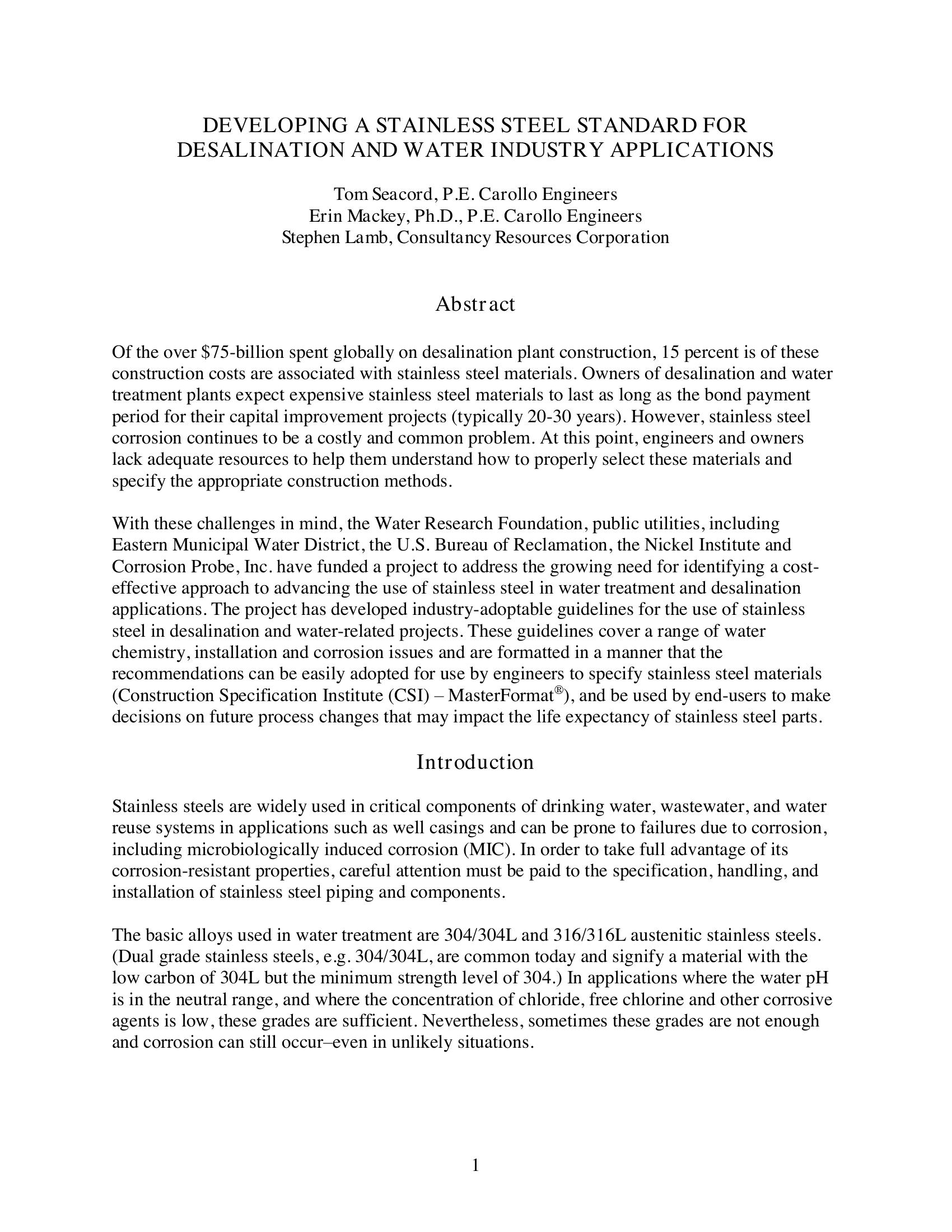 There are many grades and types of stainless steel and stainless steels are used extensively in brackish and seawater membrane treatment facilities. Stainless steel corrodes when the wrong grade or type is placed in the wrong environment. Guidelines and specifications have been developed to create a uniform approach to selecting the proper stainless steel and standard specifications.