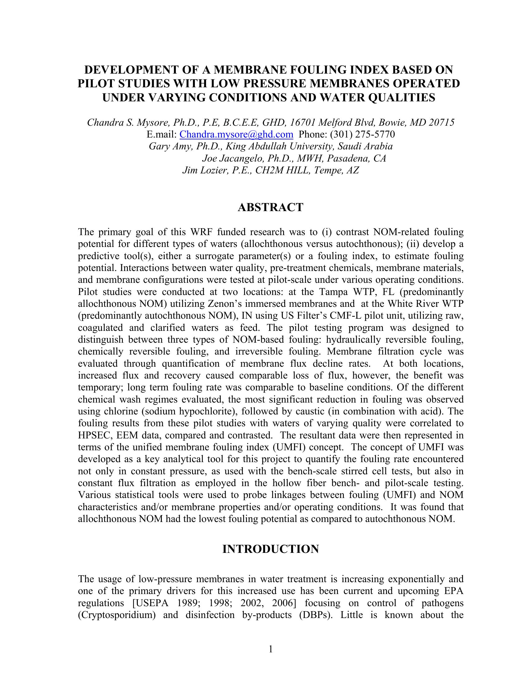 DEVELOPMENT OF A MEMBRANE FOULING INDEX BASED ON PILOT STUDIES WITH LOW PRESSURE MEMBRANES OPERATED UNDER VARYING CONDITIONS AND WATER QUALITIES