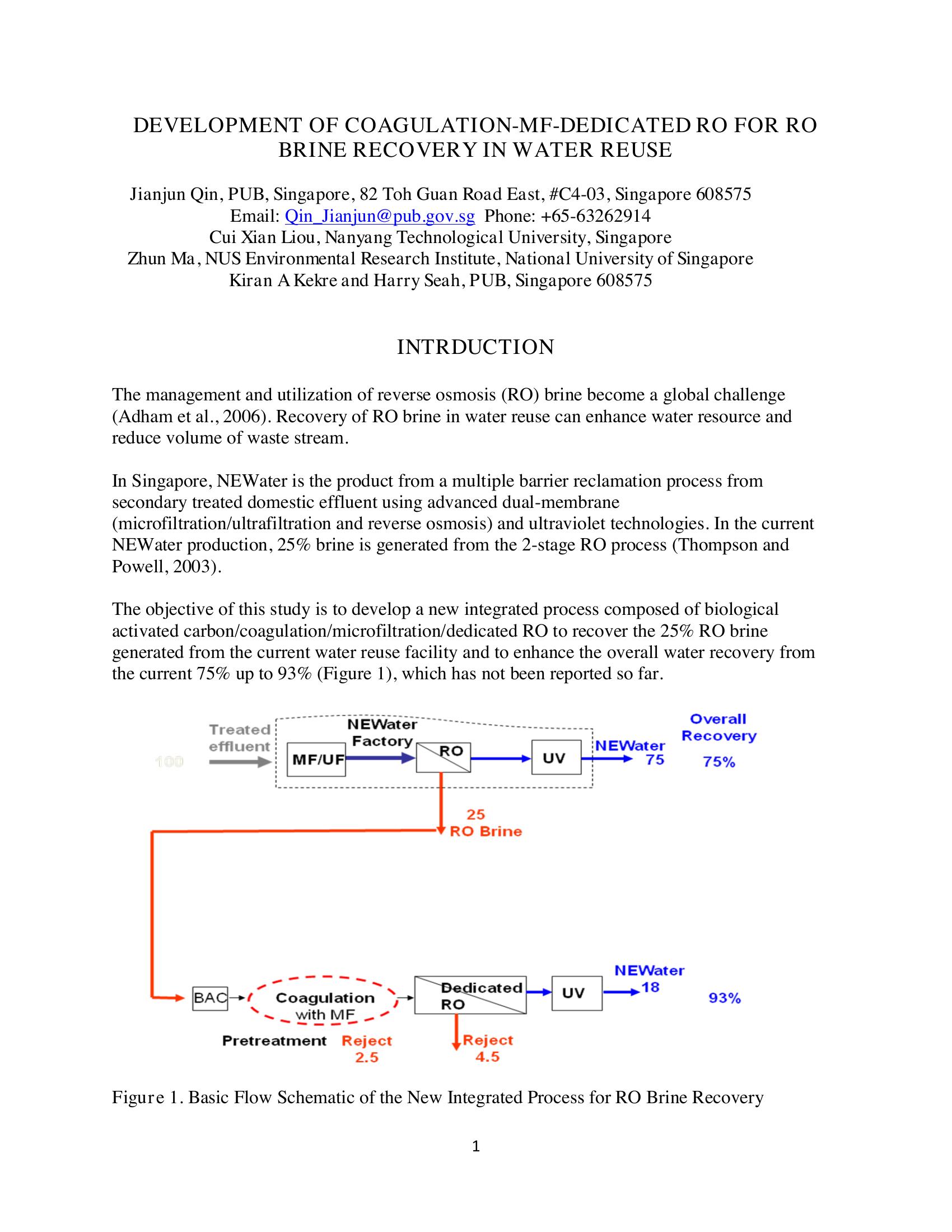 This paper discusses the development of a new integrated process composed of biological activated carbon/coagulation/microfiltration/dedicated RO. The objective was to recover 25% RO brine generated from the current water reuse facility and to enhance the overall water recovery from the current 75% up to 94% in a water reuse application. The paper describes experiments were carried out in lab scale and batch operation. It concluded that there was a potential to meet the objective but that the work needed further investigation.