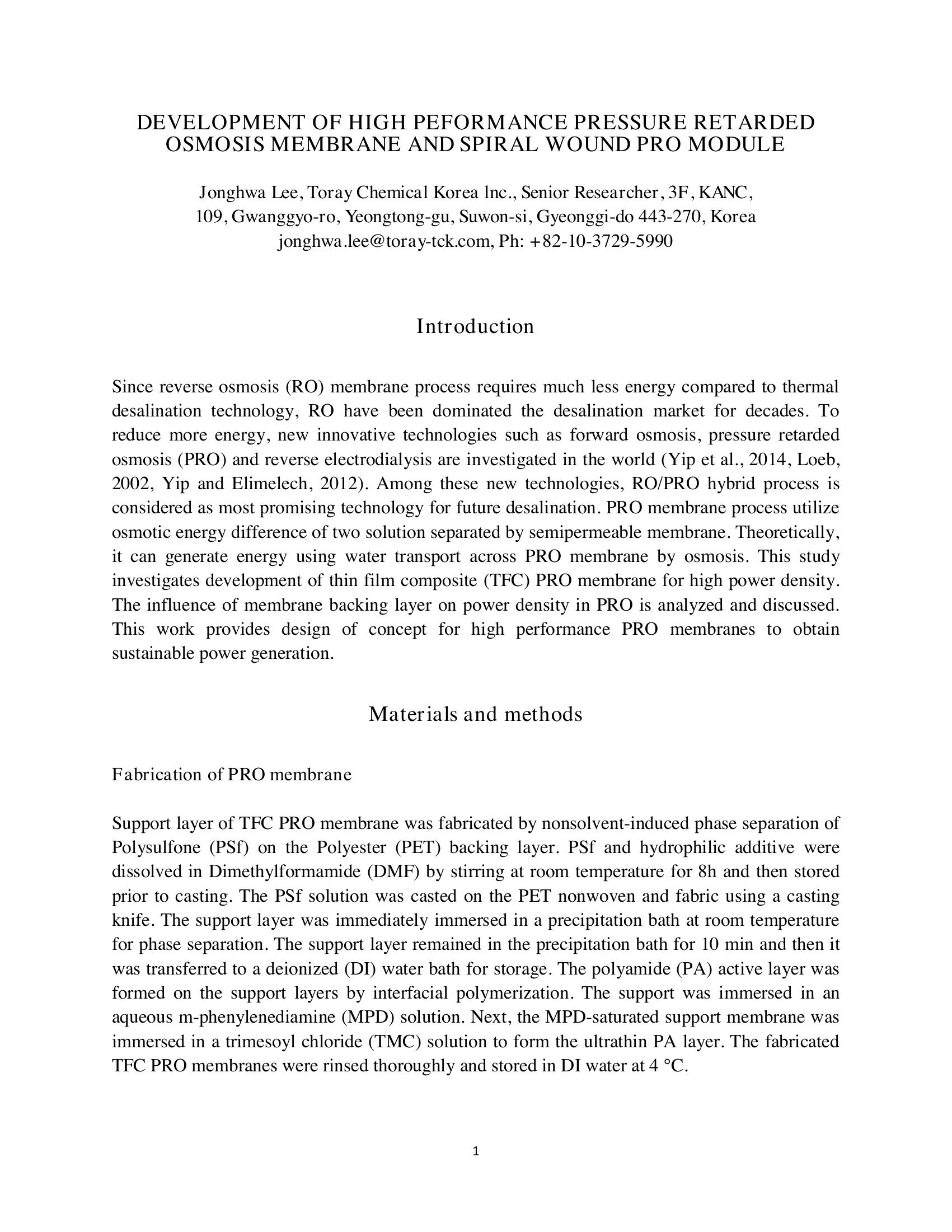 | Keywords | Pressure Retarded Osmosis (PRO), RO/PRO Hyprid Systems |