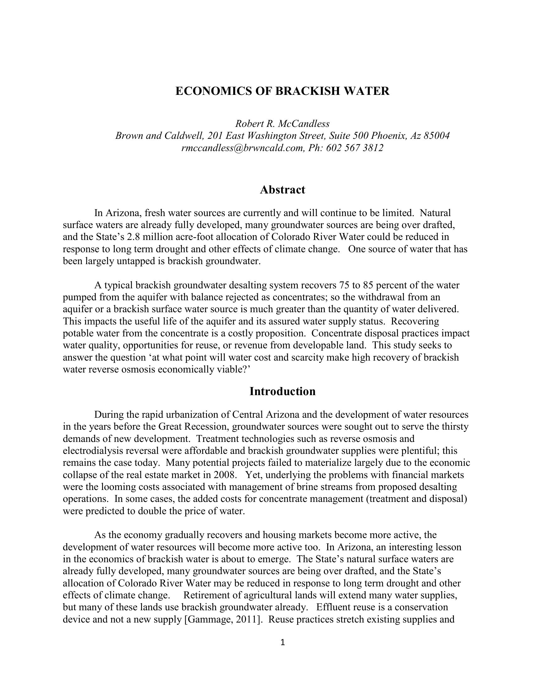 In Arizona, fresh water sources are currently and will continue to be limited. Natural surface waters are already fully developed, many groundwater sources are being over drafted, and the State’s 2.8 million acre-foot allocation of Colorado River Water could be reduced in response to long term drought and other effects of climate change. One source of water that has been largely untapped is brackish groundwater. A typical brackish groundwater desalting system recovers 75 to 85% of the water pumped from the aquifer with balance rejected as concentrates; so the withdrawal from an aquifer or a brackish surface water source is much greater than the quantity of water delivered. This impacts the useful life of the aquifer and its assured water supply status. Recovering potable water from the concentrate is a costly proposition. Concentrate disposal practices impact water quality, opportunities for reuse, or revenue from developable land. This study seeks to answer the question “at what point will water cost and scarcity make high recovery of brackish water reverse osmosis economically viable?”