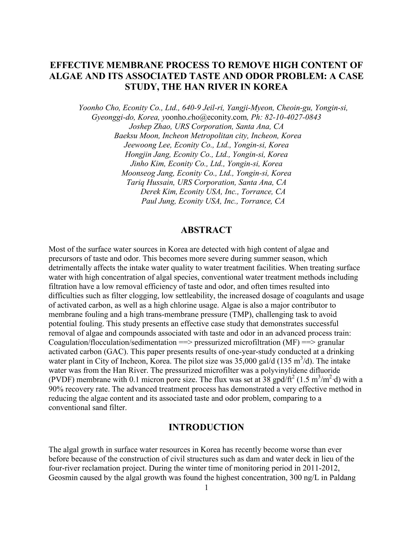 Effective Membrane Process to Remove High Content of Algae and Its Associated Taste and Odor Problem : A Case Study, The Han River in Korea