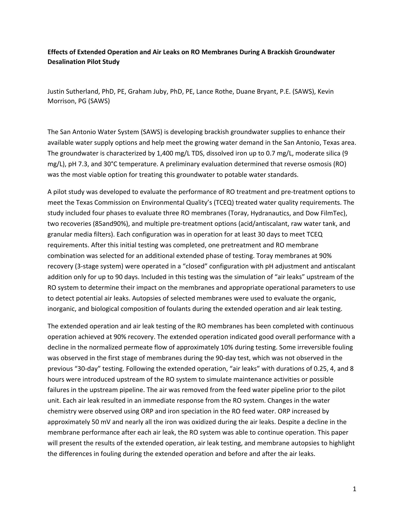 The paper describes a pilot study at the San Antonio Water System to evaluate the performance of Reverse Osmosis treatment and pre?treatment options to meet the Texas Commission on Environmental Quality’s (TCEQ) treated water quality requirements. This paper will present the results of the extended operation, air leak testing, and membrane autopsies to highlight the differences in fouling during the extended operation and before and after the air leaks.