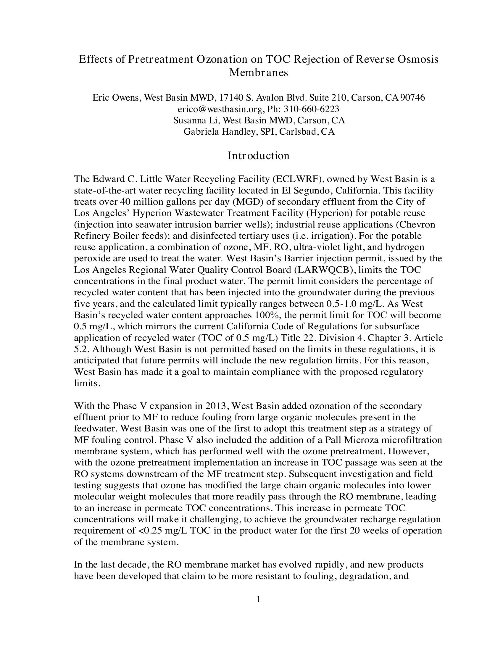 This testing will characterize RO elements for fouling performance and TOC rejection while treating ozonated secondary effluent. This paper will document the results of this testing, offering an important body of data that will be of use in the selection of RO membranes for all potable reuse projects considering the use of ozone as pretreatment to MF.