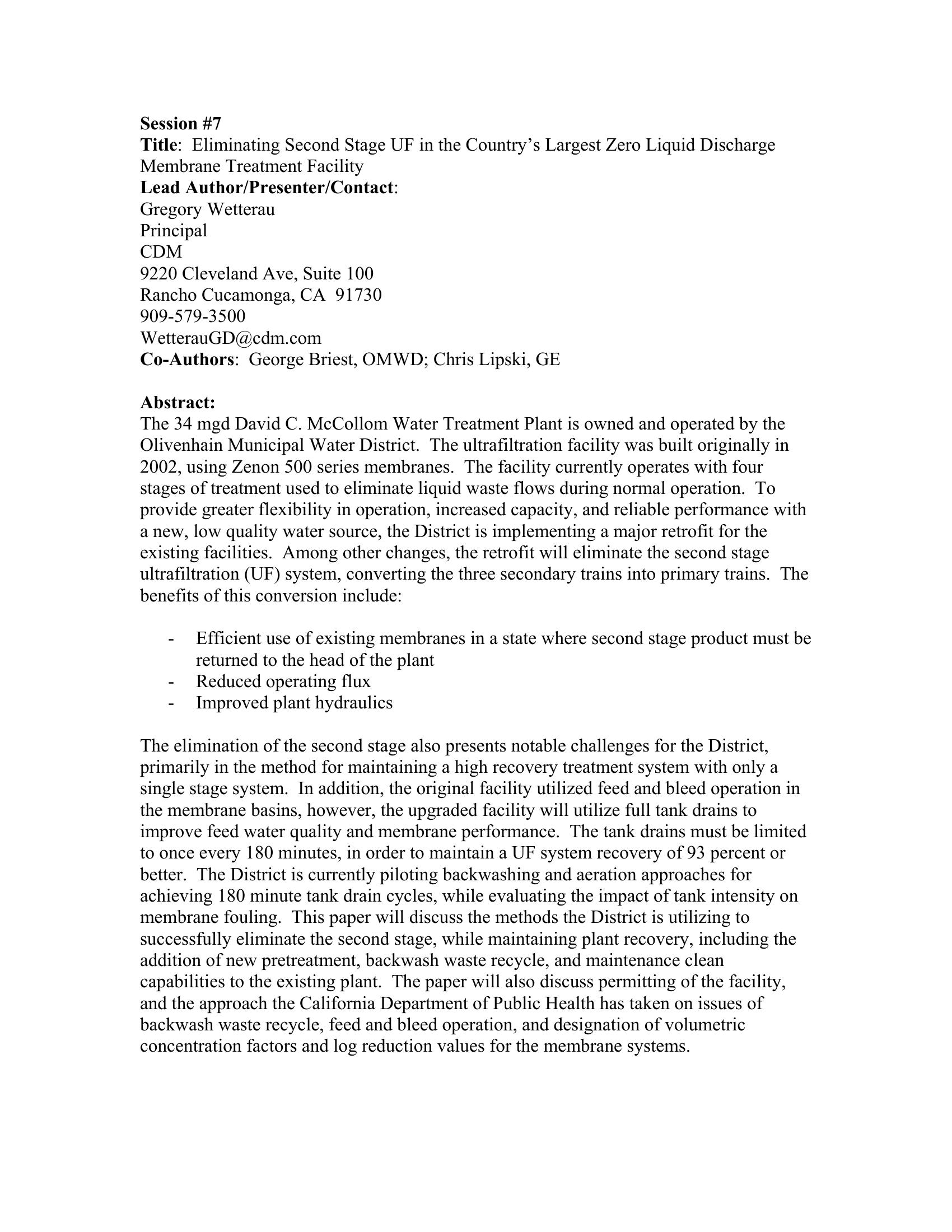 This paper describes the pilot testing and retrofit of a CA UF drinking facility treating a degraded quality surface water which operates with ZLD. Challenges encountered during the project include: permtting, deteriorating source water quality and continued operations. Final design eliminates one stage, decreases flux by 15% and reduces energy and operating costs.