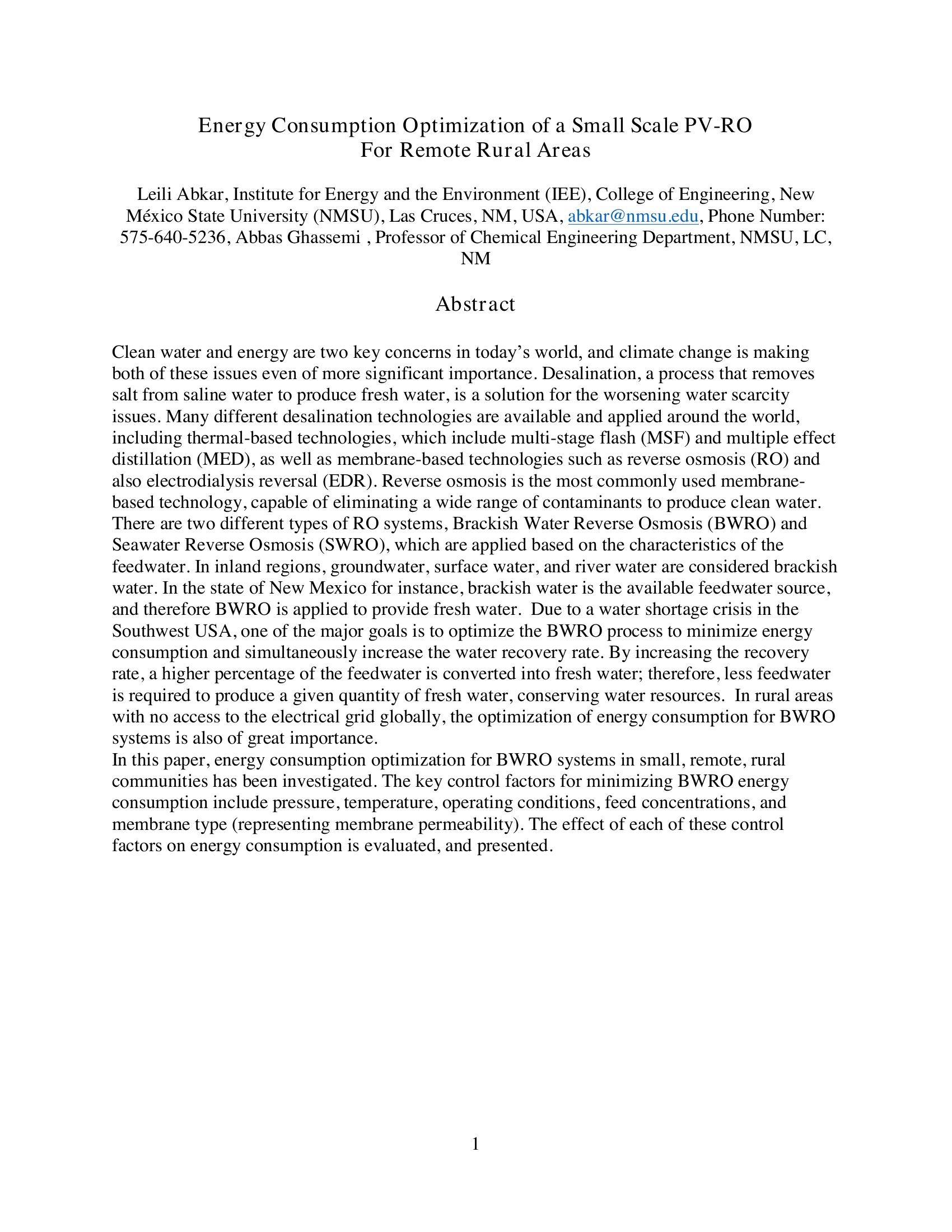 | Keywords | Energy Consumption, Rural Areas, Brackish Water RO (BWRO), |