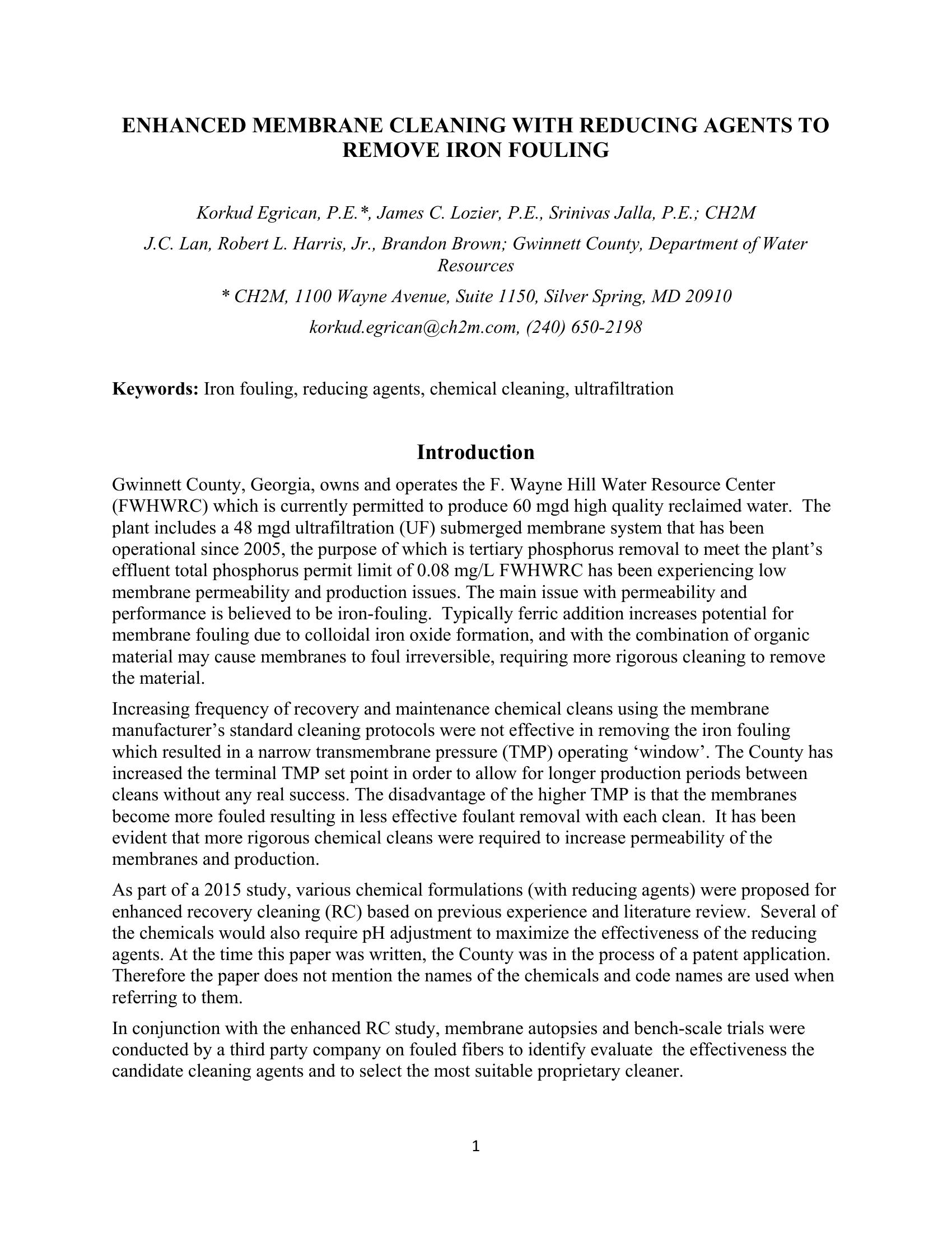 | Keywords | cleaning, iron removal, ultrafiltration, Gwinnett County |