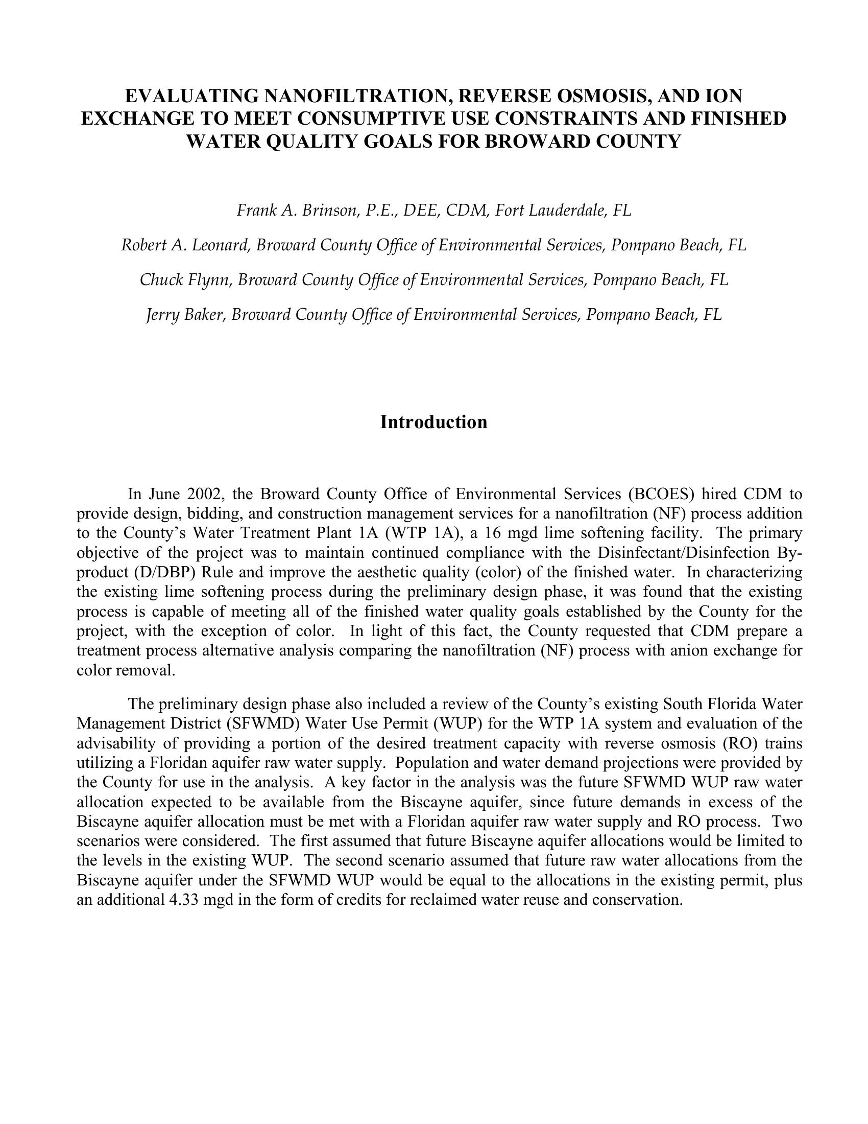 Evaluating Nanofiltration, Reverse Osmosis, and Ion Exchange to Meet Consumptive Use Constraints and Finished Water Quality Goals for Broward County