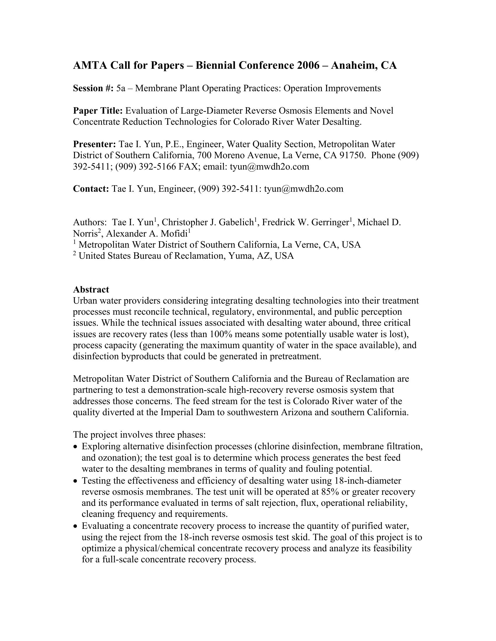 Pilot testing at MWD in CA to evaluate large diameter elements, disinfection processes and concentrate recovery.