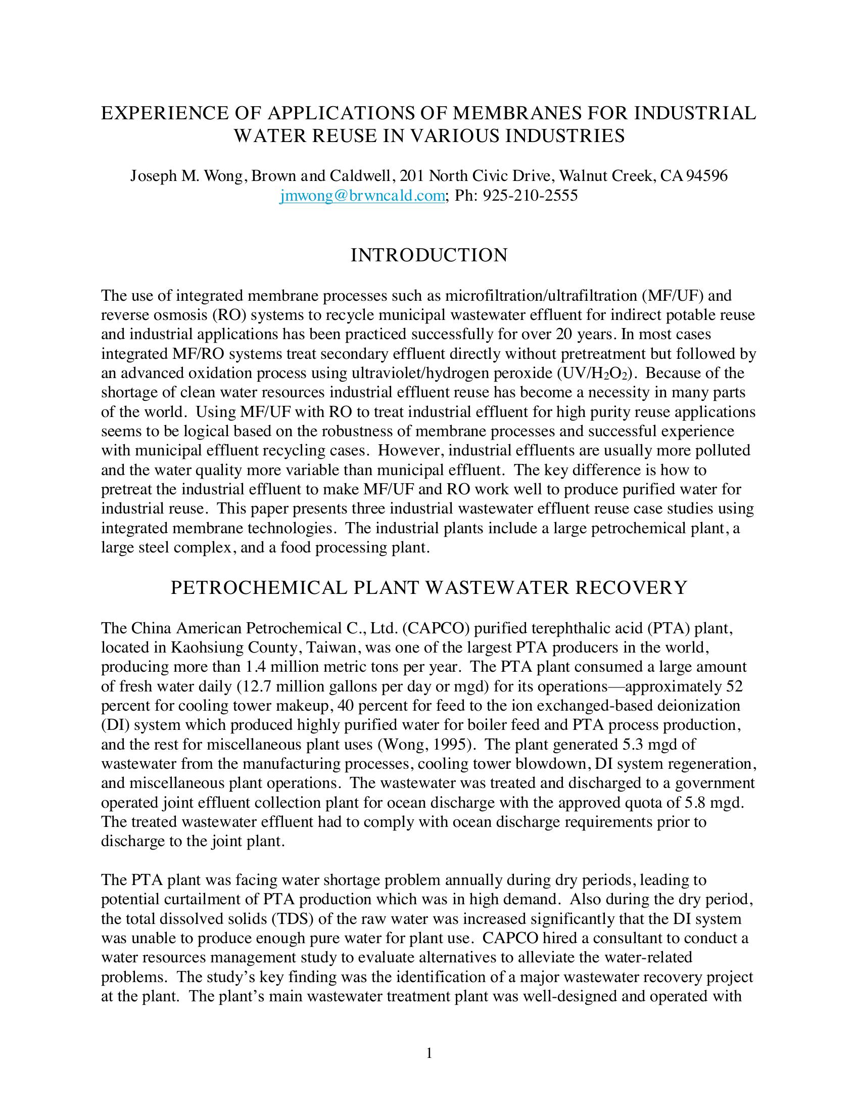 Membrane technologies such as microfiltration/ultrafiltration and reverse osmosis have been used successfully for treatment of municipal wastewater effluent for indirect potable reuse for nearly 20 years. The use of these membrane technologies are not as prevalent for industrial effluent reuse due to variable water quality and cost considerations. However, there are successful membrane-based water reuse projects that can help to conserve water in arid areas while providing good economic viability. This presentation presents three industrial water reuse case studies from three different industries: petrochemical, steel manufacturing, and food processing. Impetus for reuse, feasibility, testing, implementation and cost analysis are presented.