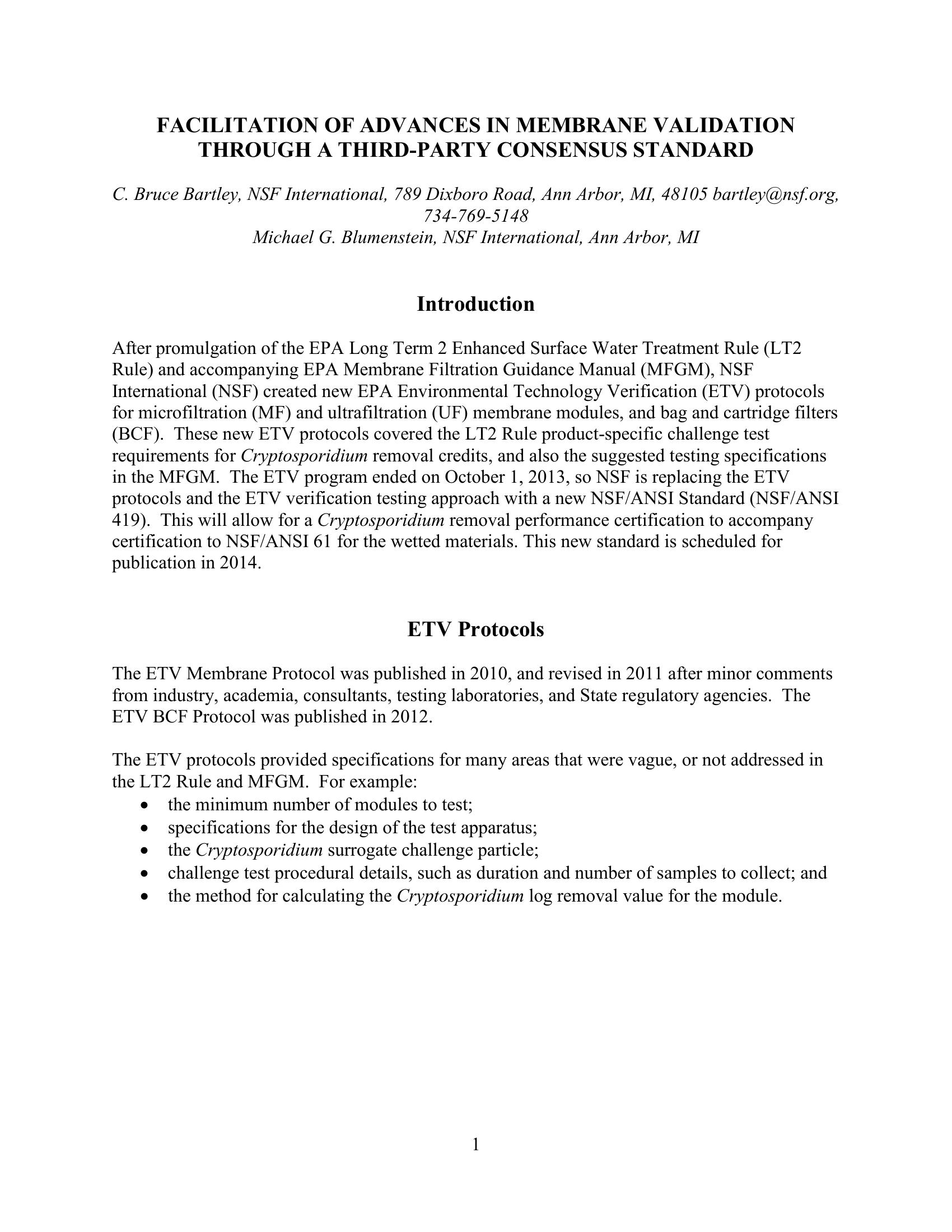 Facilitation of Advances in UF Membrane Validation through a Third Party Consensus Standard