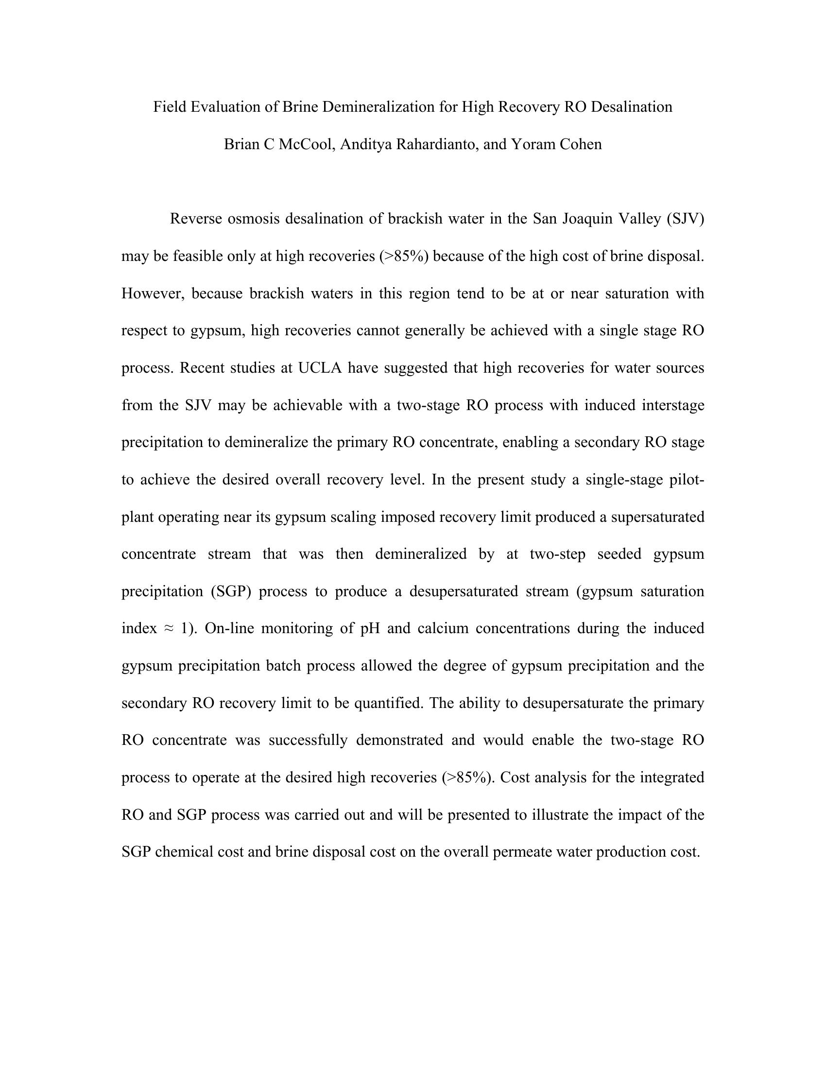RO desalination of brackish water in the San Joaquin Valley may be feasible only at high recoveries that may be achieved through the use of a two-stage RO process with inter-stage demineralization of scale precursors. In the present work, the concentrated brine from a pilot RO system operating in the San Joaquin Valley was demineralized by seeded gypsum precipitation to reduce the gypsum scaling propensity sufficiently to enable secondary RO recovery corresponding to an overall recovery greater than 85%. Brine was collected from the RO pilot system during scale-free operation at 52.3% recovery and then treated to remove scale precursors (e.g. calcium ion, silica). At this recovery the antiscalant concentration in the retentate was ~6 ppm. Demineralization was achieved via seeded gypsum precipitation (SGP) of the supersaturated retentate to induce gypsum precipitation. SGP was performed in a 20-liter stirred-tank batch crystallizer with continuous monitoring of calcium ion activity, pH, and temperature. The ability to desupersaturate the pilot system’s primary RO concentrate was successfully demonstrated for brackish water in the San Joaquin Valley. Calcium concentration was reduced by 32% to 34% and the gypsum saturation index was reduced to near saturation (to ~1.1). This successful demineralization was achieved by seeded gypsum precipitation and would enable a two-stage RO process to operate at the desired high recoveries (>85%) necessary for a cost effective desalination process.