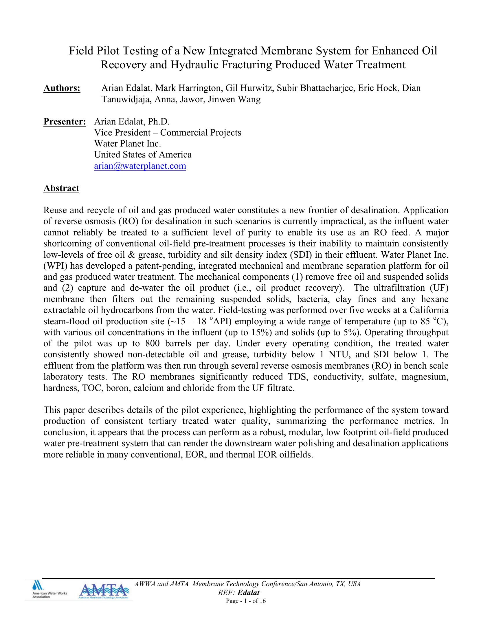 This paper describes details of the field pilot experience, highlighting the performance of an integrated membrane system toward production of consistent tertiary treated water quality. Details of the pilot test for enhanced oil recovery and hydraulic fracturing produced water treatment are presented.