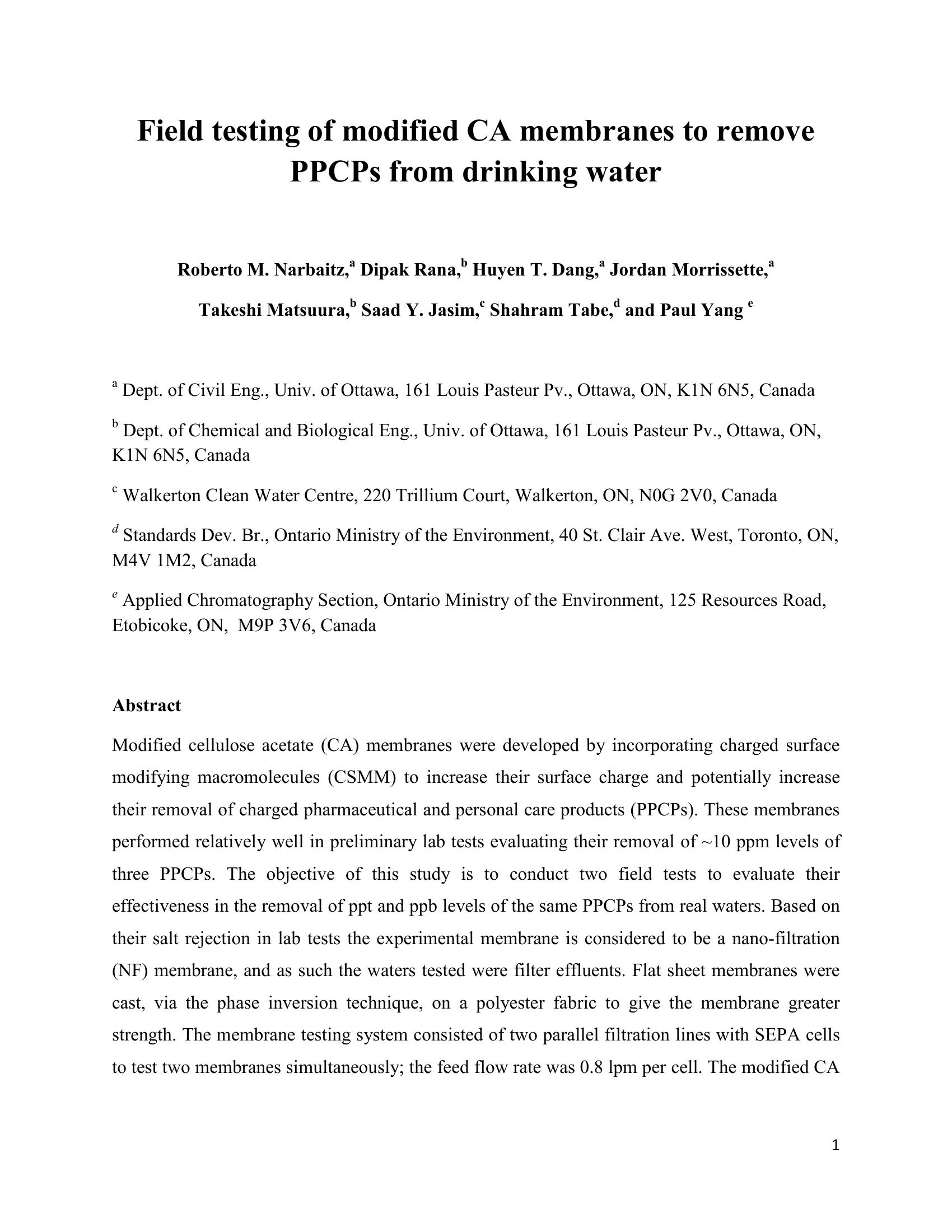 This paper discusses the development of modified cellulose acetate (CA) membranes to increase their surface charge and potentially increase their removal of charged pharmaceutical and personal care products (PPCPs). The objective of this study is to conduct two field tests to evaluate their effectiveness in the removal of ppt and ppb levels of the same PPCPs from real waters. Discussed in detail are the various membrane considerations and the results obtained.