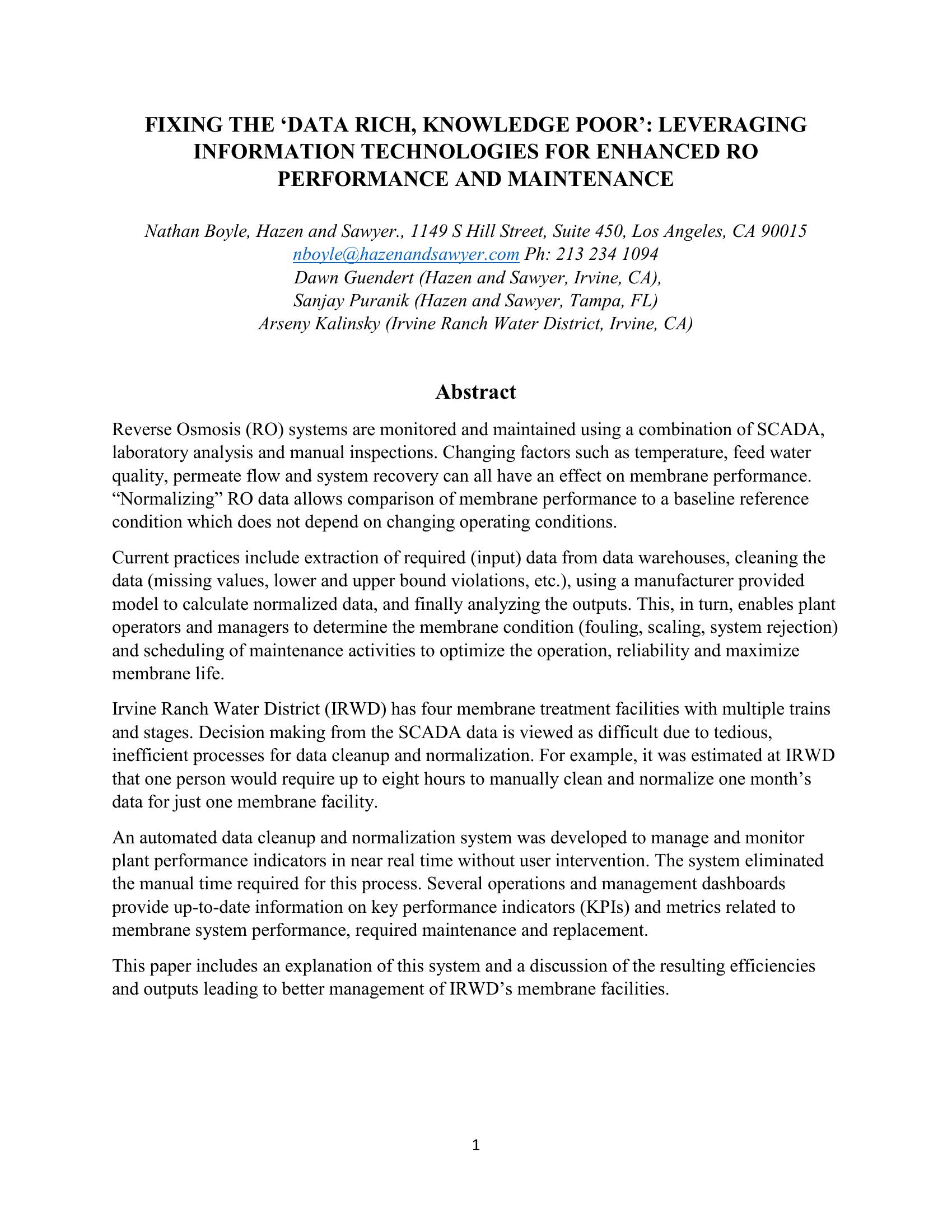 Reverse Osmosis (RO) systems are monitored and maintained using a combination of SCADA, laboratory analysis and manual inspections. Changing factors such as temperature, feed water quality, permeate flow and system recovery can all have an effect on membrane performance. “Normalizing” RO data allows comparison of membrane performance to a baseline reference condition which does not depend on changing operating conditions. Current practices include extraction of required (input) data from data warehouses, cleaning the data (missing values, lower and upper bound violations, etc.), using a manufacturer provided model to calculate normalized data, and finally analyzing the outputs. This, in turn, enables plant operators and managers to determine the membrane condition (fouling, scaling, system rejection) and scheduling of maintenance activities to optimize the operation, reliability and maximize membrane life. Irvine Ranch Water District (IRWD) has four membrane treatment facilities with multiple trains and stages. Decision making from the SCADA data is viewed as difficult due to tedious, inefficient processes for data cleanup and normalization. For example, it was estimated at IRWD that one person would require up to eight hours to manually clean and normalize one month’s data for just one membrane facility. An automated data cleanup and normalization system was developed to manage and monitor plant performance indicators in near real time without user intervention. The system eliminated the manual time required for this process. Several operations and management dashboards provide up-to-date information on key performance indicators (KPIs) and metrics related to membrane system performance, required maintenance and replacement. This paper includes an explanation of this system and a discussion of the resulting efficiencies and outputs leading to better management of IRWD’s membrane facilities.