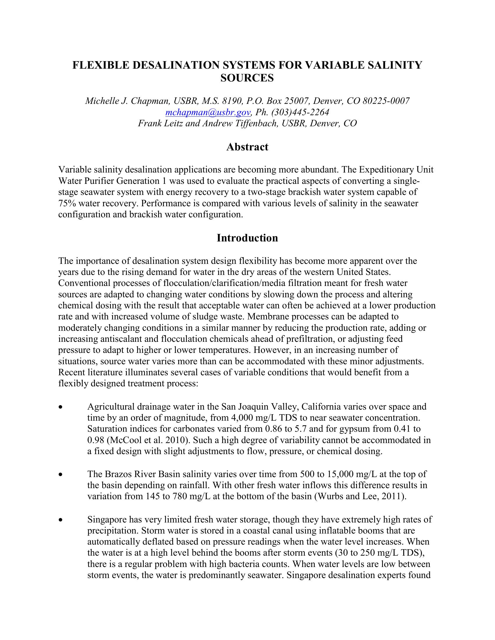 Variable salinity desalination applications are becoming more abundant. The Expeditionary Unit Water Purifier Generation 1 was used to evaluate the practical aspects of converting a singlestage seawater system with energy recovery to a two-stage brackish water system capable of 75% water recovery. Performance is compared with various levels of salinity in the seawater configuration and brackish water configuration.