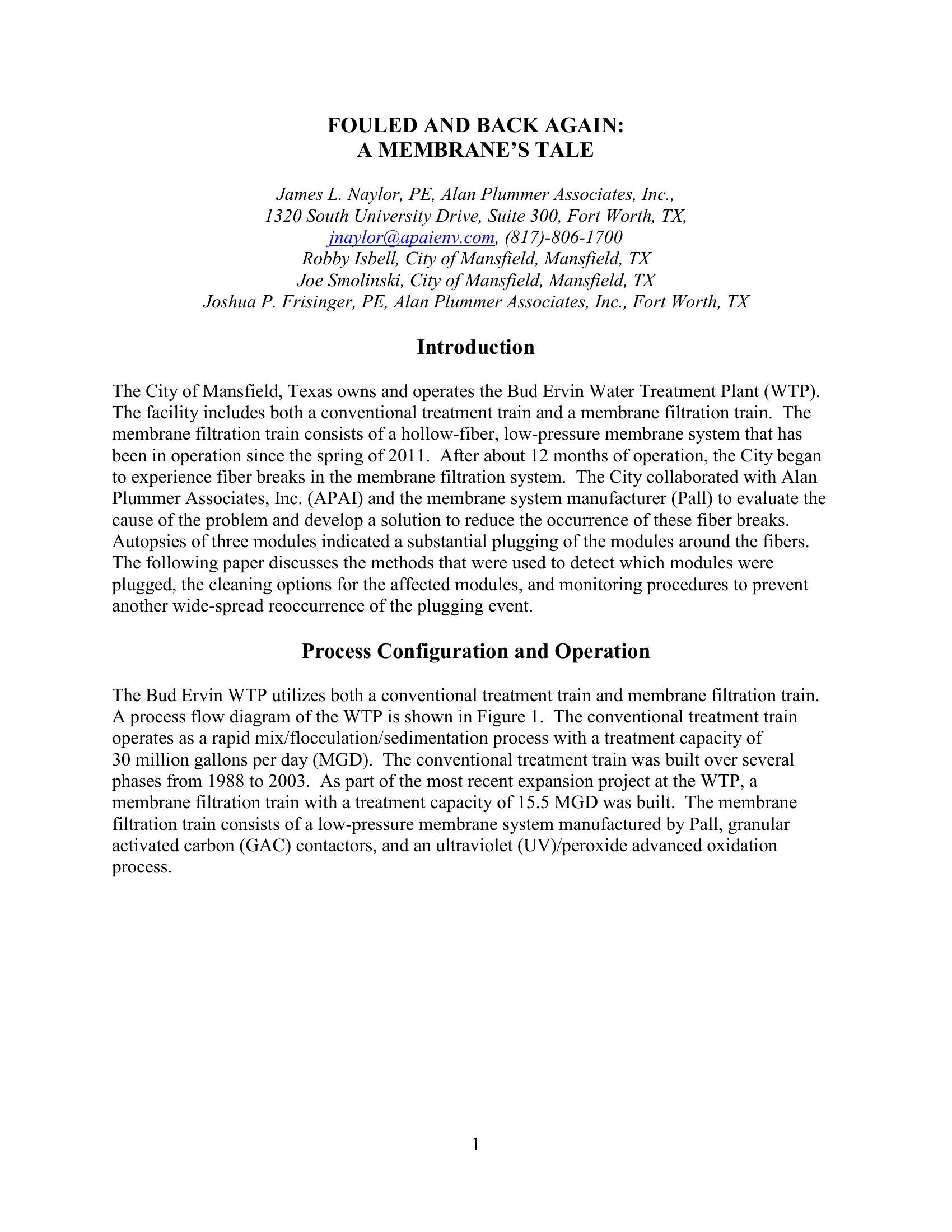 The City of Mansfield, Texas owns and operates the Bud Ervin Water Treatment Plant (WTP). The facility includes both a conventional treatment train and a membrane filtration train consisting of a hollow-fiber, low-pressure membrane system that has been in operation since the spring of 2011. After about 12 months of operation, the City began to experience fiber breaks in the membrane filtration system. The City evaluated the cause of the problem and developed a solution to reduce the occurrence of these fiber breaks. The paper discusses the methods that were used to detect which modules were plugged, the cleaning options for the affected modules, and monitoring procedures to prevent another wide-spread reoccurrence of the plugging event.