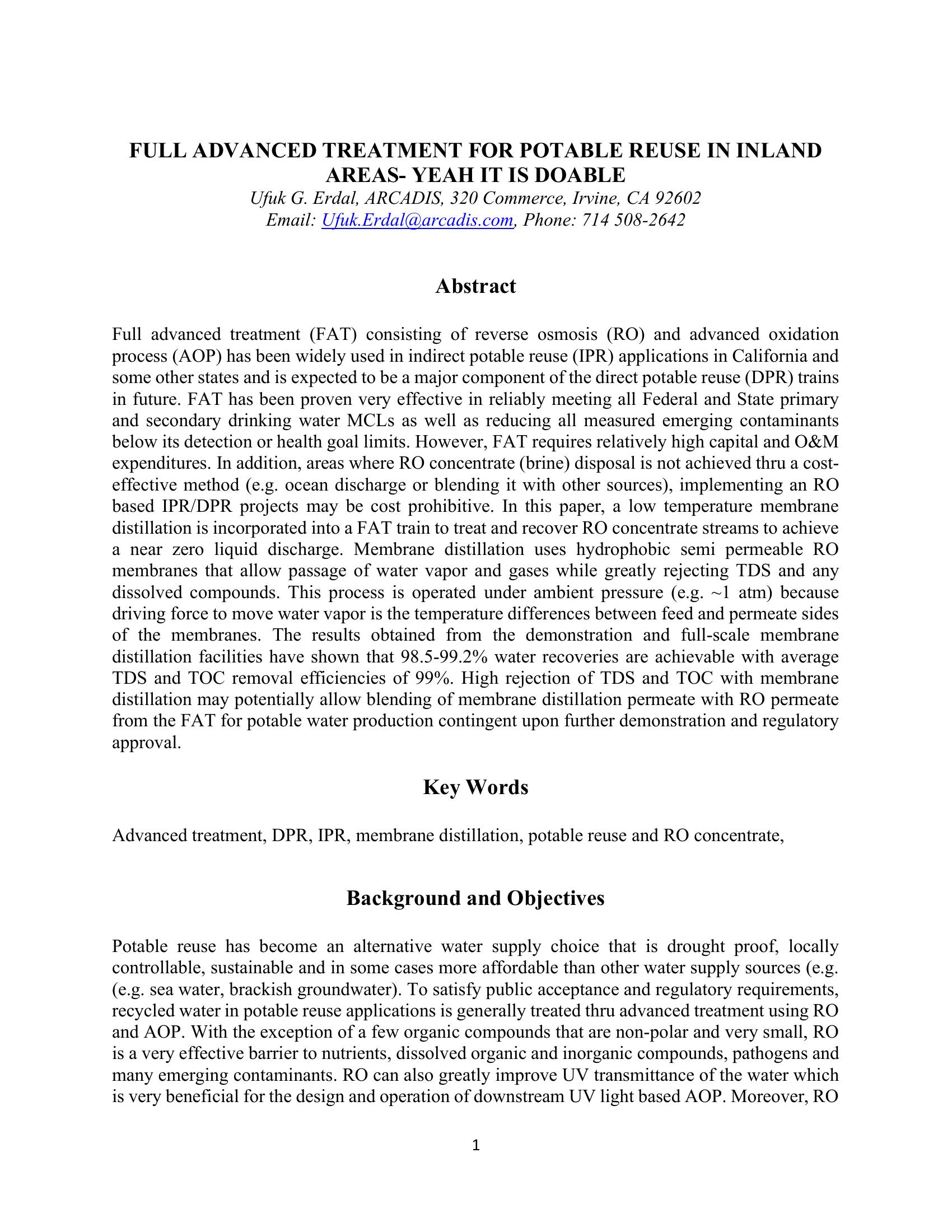KeywordsAdvanced treatment, DPR, IPR, Membrane Distillation, Potable Reuse, RO Concentrate