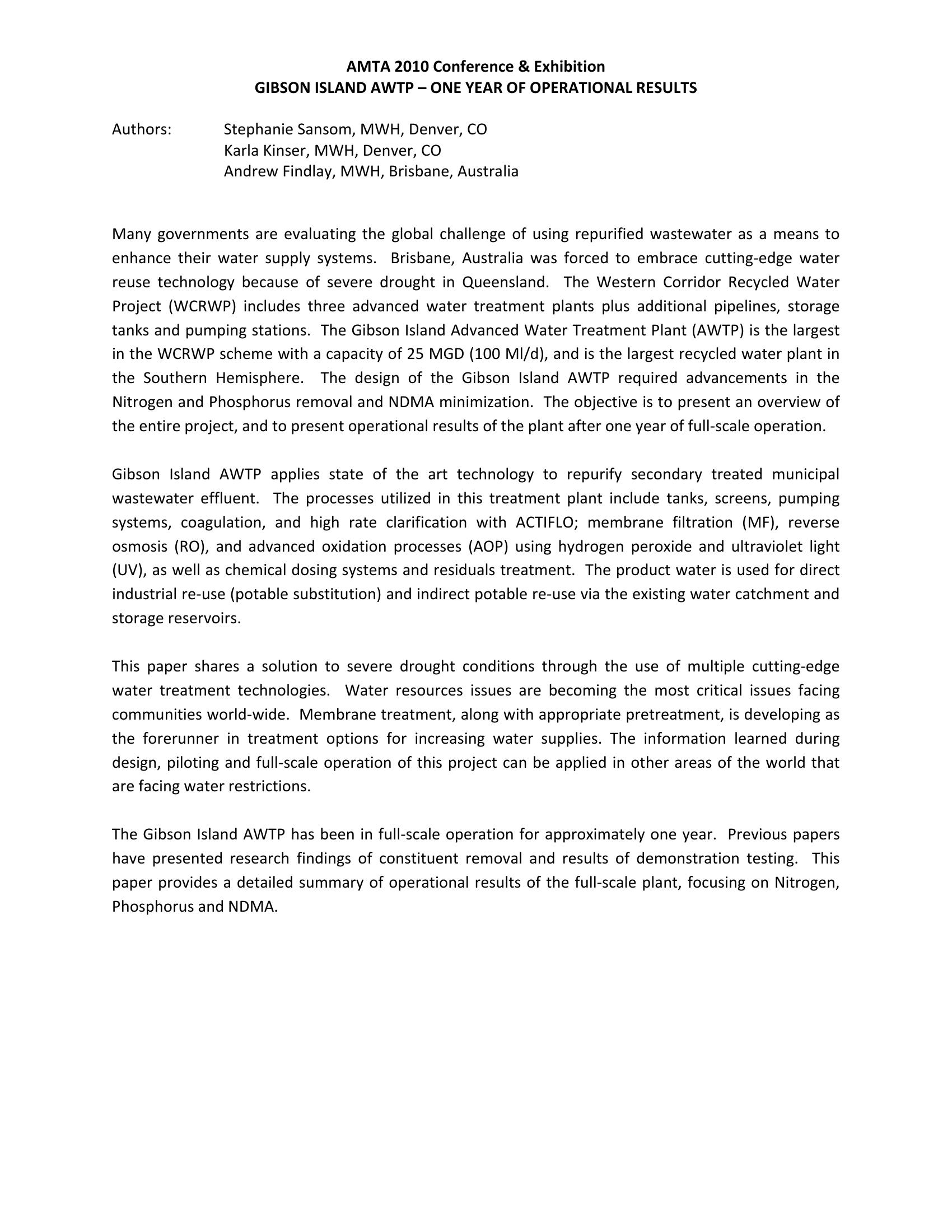 The Gibson Island Advanced Water treatment plant is a 25 MGD facility that treats wastewater effluent to potable water standards. The treatment system includes Actiflo pretreatment, MF-RO-and UV/AOP with hydrogen peroxide. The treated water is used as industrial re-use and indirect potable re-use via storage reservoirs. The plant has operated for over 1 year with no signs of significant membrane fouling.