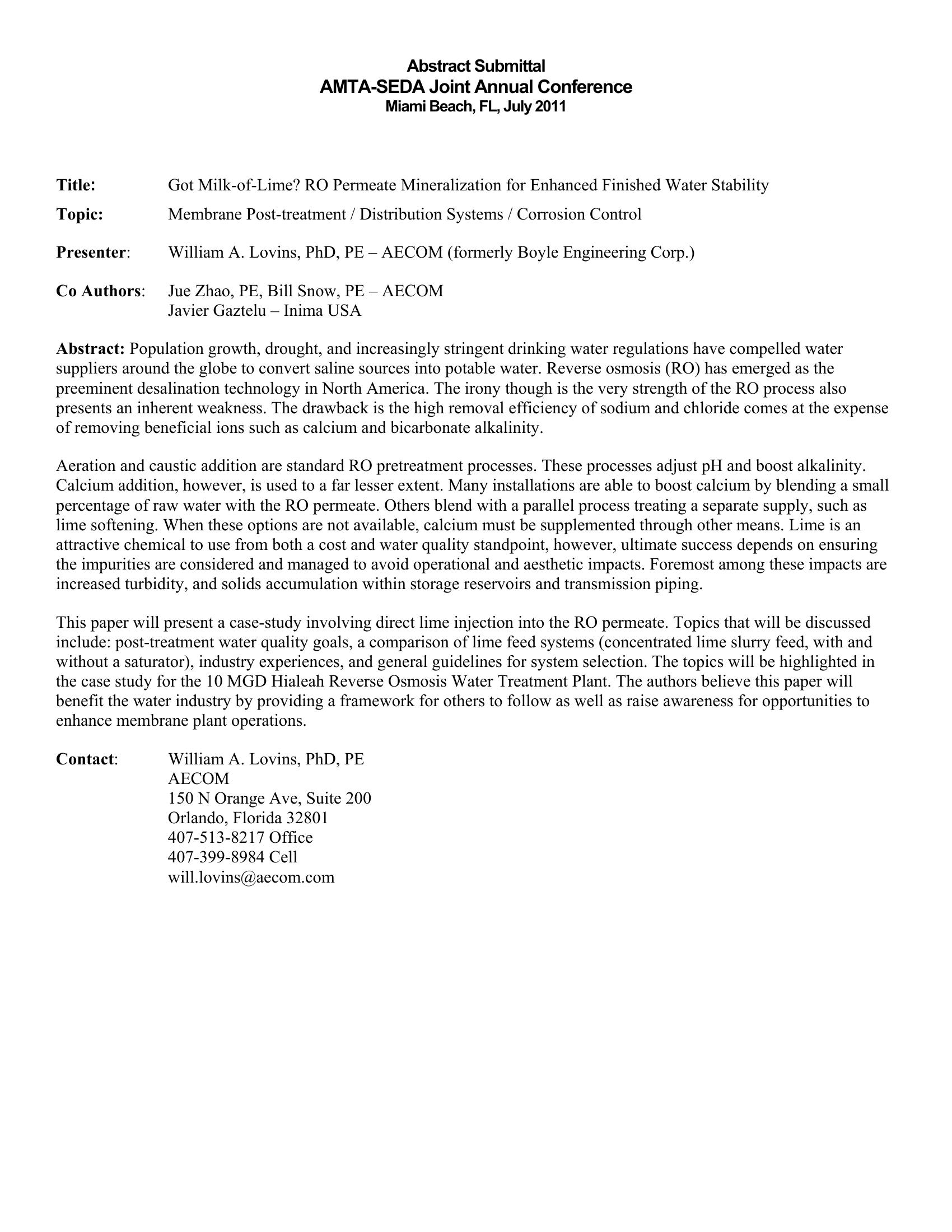 | Keywords | mineralization, lime, reverse osmosis, permeate stability |