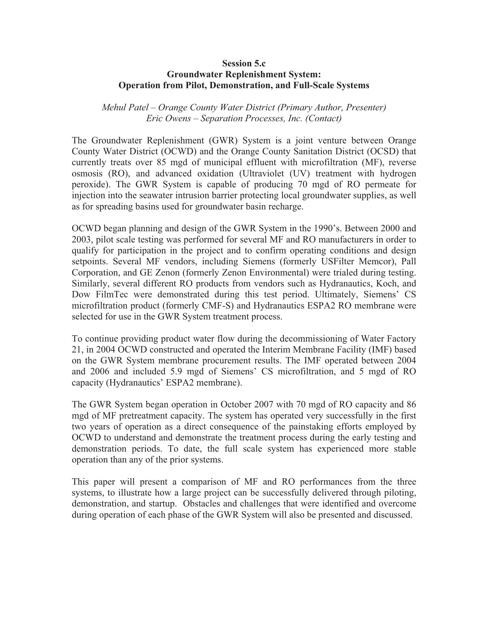Groundwater Replenishment System: Operation from Pilot, Demonstration, and Full-Scale Systems