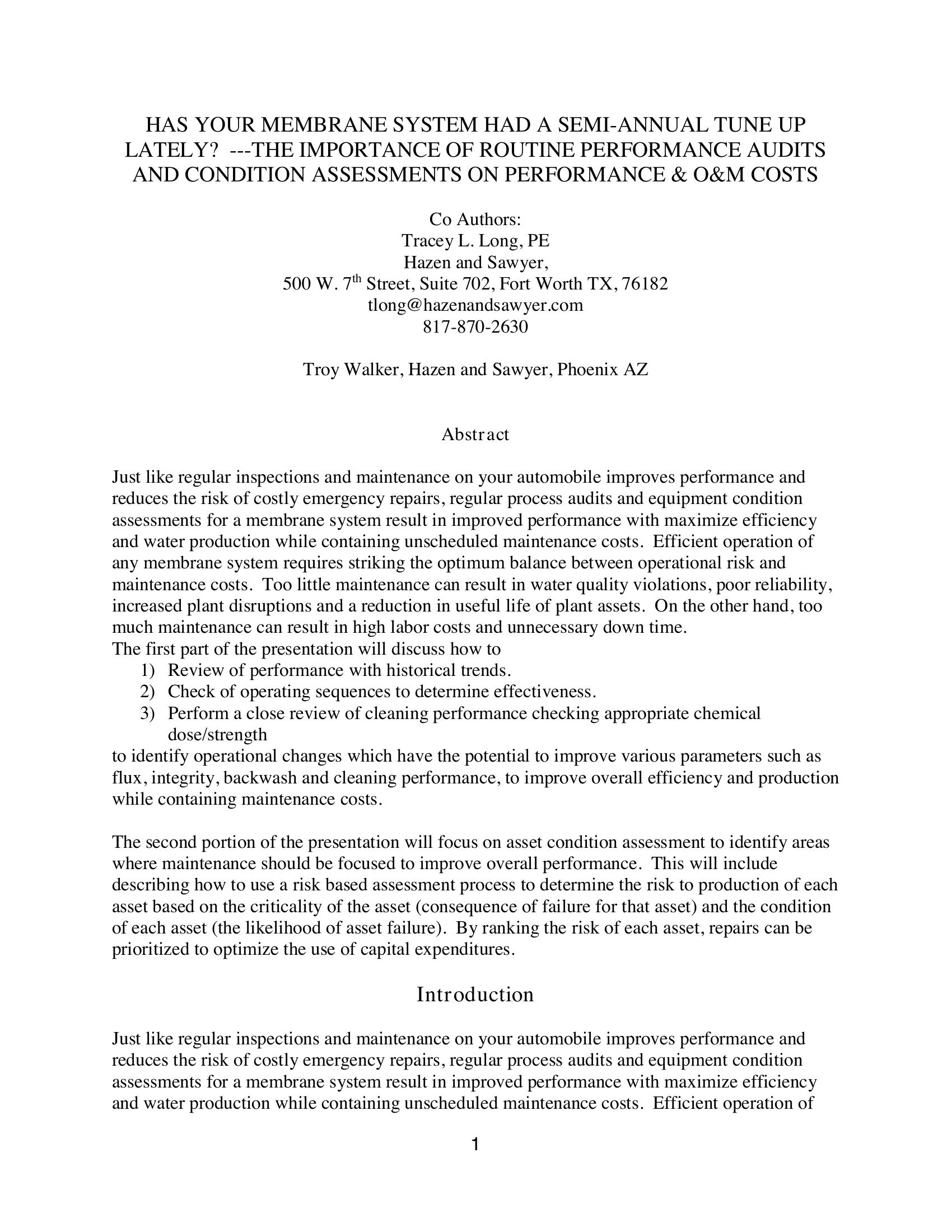 The first part of the presentation will discuss how to review membrane system performance by looking at historical trends, checking operating sequences to determine effectiveness and perform a close review of cleaning performance checking appropriate chemical dose/strength to identify operational changes. The goal is to improve overall efficiency and production while containing maintenance costs. The second portion of the presentation will focus on asset condition assessment to identify areas where maintenance should be focused to improve overall performance
