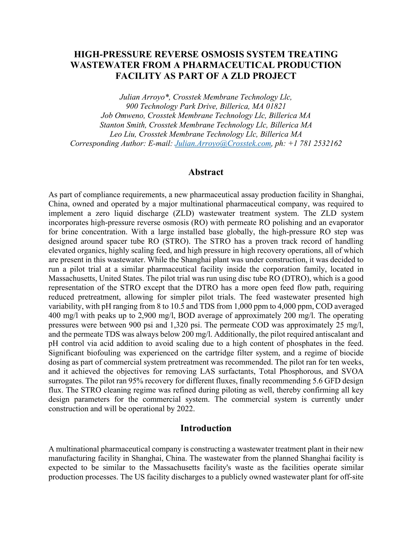 As part of compliance requirements, a new pharmaceutical assay production facility in Shanghai, China, owned and operated by a major multinational pharmaceutical company, was required to implement a zero liquid discharge (ZLD) wastewater treatment system. The ZLD system incorporates high-pressure reverse osmosis (RO) with permeate RO polishing and an evaporator for brine concentration. With a large installed base globally, the high-pressure RO step was designed around spacer tube RO (STRO). The STRO has a proven track record of handling elevated organics, highly scaling feed, and high pressure in high recovery operations, all of which are present in this wastewater. While the Shanghai plant was under construction, it was decided to run a pilot trial at a similar pharmaceutical facility inside the corporation family, located in Massachusetts, United States. The pilot trial was run using disc tube RO (DTRO), which is a good representation of the STRO except that the DTRO has a more open feed flow path, requiring reduced pretreatment, allowing for simpler pilot trials. The feed wastewater presented high variability, with pH ranging from 8 to 10.5 and TDS from 1,000 ppm to 4,000 ppm, COD averaged 400 mg/l with peaks up to 2,900 mg/l, BOD average of approximately 200 mg/l. The operating pressures were between 900 psi and 1,320 psi. The permeate COD was approximately 25 mg/l, and the permeate TDS was always below 200 mg/l. Additionally, the pilot required antiscalant and pH control via acid addition to avoid scaling due to a high content of phosphates in the feed. Significant biofouling was experienced on the cartridge filter system, and a regime of biocide dosing as part of commercial system pretreatment was recommended. The pilot ran for ten weeks, and it achieved the objectives for removing LAS surfactants, Total Phosphorous, and SVOA surrogates. The pilot ran 95% recovery for different fluxes, finally recommending 5.6 GFD design flux. The STRO cleaning regime was refined during piloting as well, thereby confirming all key design parameters for the commercial system. The commercial system is currently under construction and will be operational by 2022.