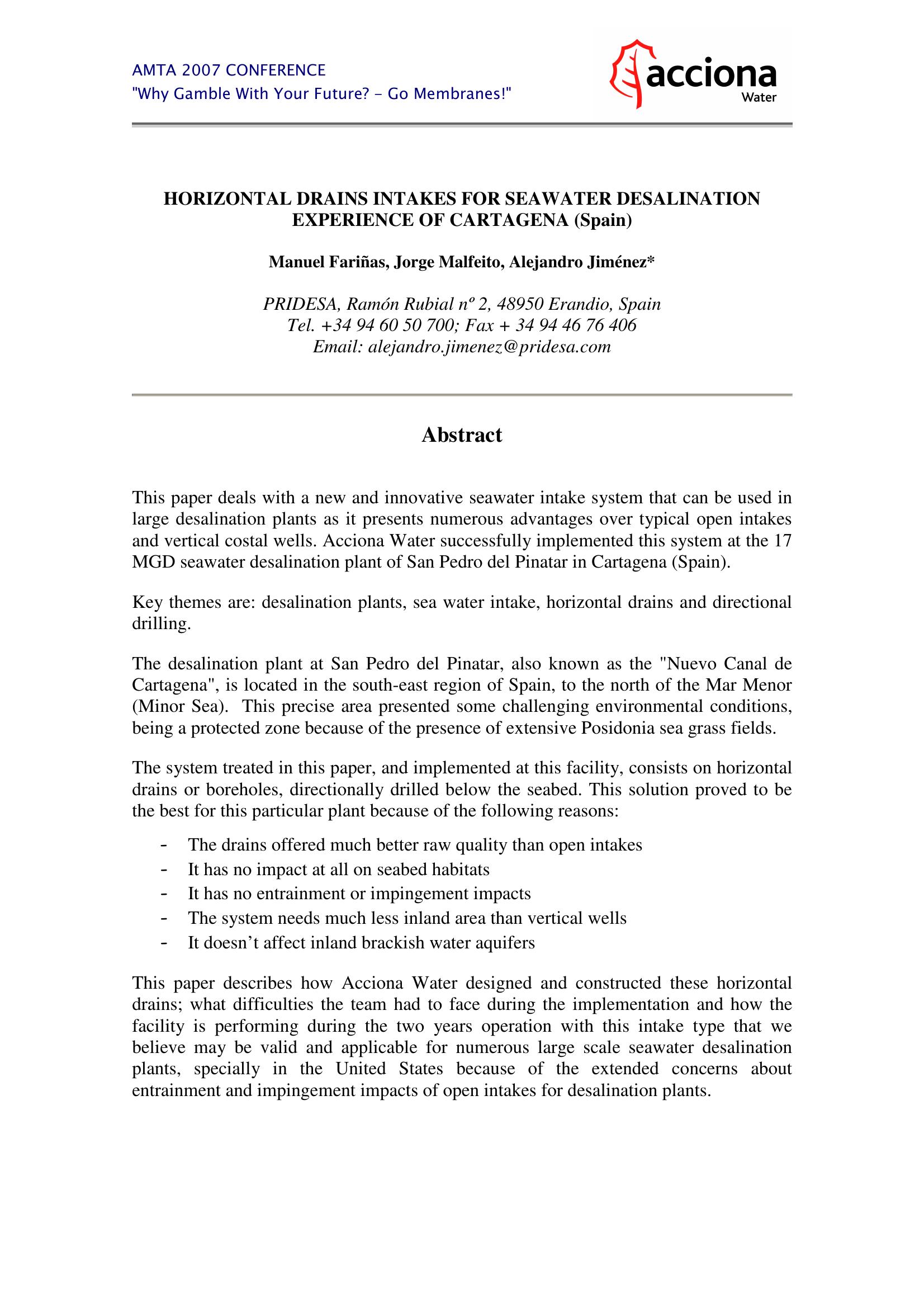 This paper describes how Acciona Water designed and constructed these horizontal drains; what difficulties the team had to face during the implementation and how the facility is performing during the two years operation with this intake type that we believe may be valid and applicable for numerous large scale seawater desalination plants, specially in the United States because of the extended concerns about entrainment and impingement impacts of open intakes for desalination plants.