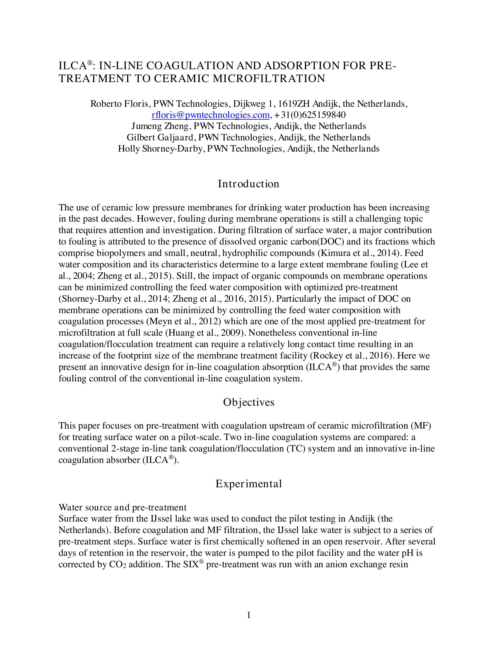 ILCA: In-Line Coagulation and Absorption for Pre-Treatment to Ceramic Microfiltration