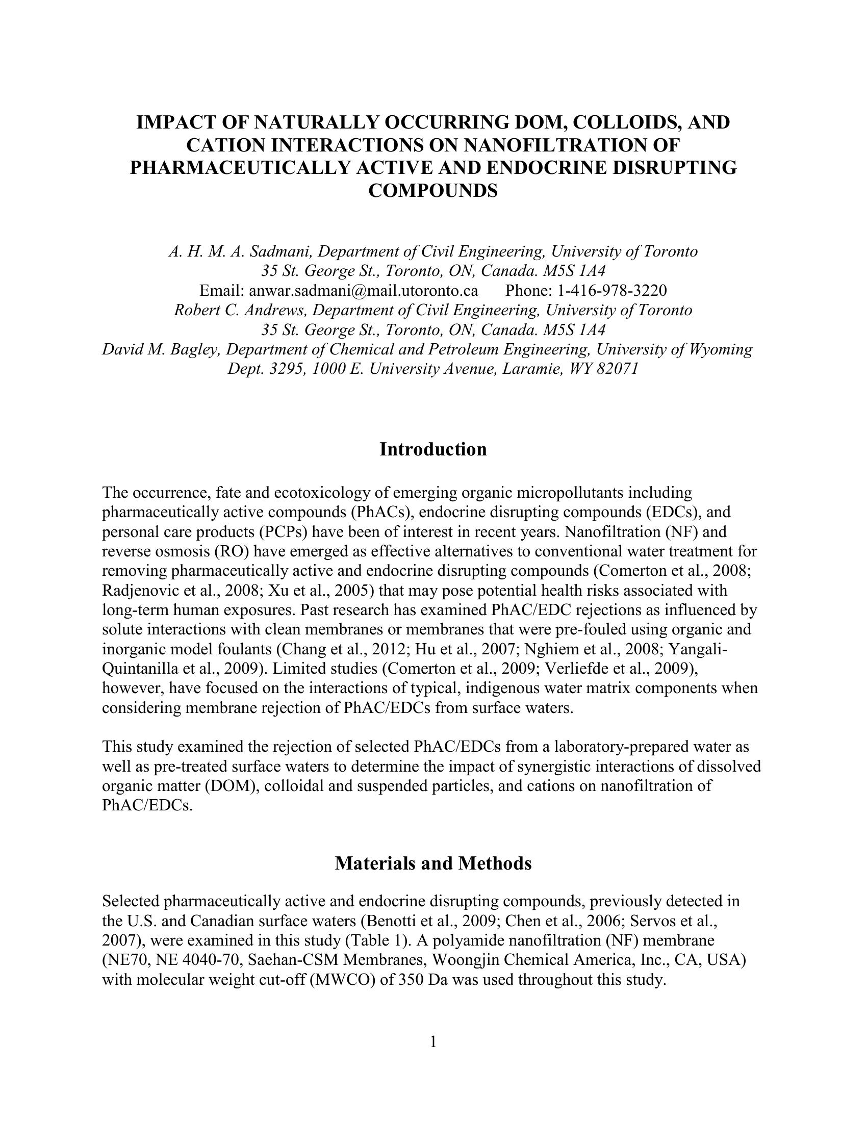 The occurrence, fate and ecotoxicology of emerging organic micropollutants including pharmaceutically active compounds (PhACs), endocrine disrupting compounds (EDCs), and personal care products (PCPs) have been of interest in recent years. Nanofiltration (NF) and reverse osmosis (RO) have emerged as effective alternatives to conventional water treatment for removing pharmaceutically active and endocrine disrupting compounds (Comerton et al., 2008; Radjenovic et al., 2008; Xu et al., 2005) that may pose potential health risks associated with long-term human exposures. This study examined the rejection of selected PhAC/EDCs from a laboratory-prepared water as well as pre-treated surface waters to determine the impact of synergistic interactions of dissolved organic matter (DOM), colloidal and suspended particles, and cations on nanofiltration of PhAC/EDCs.