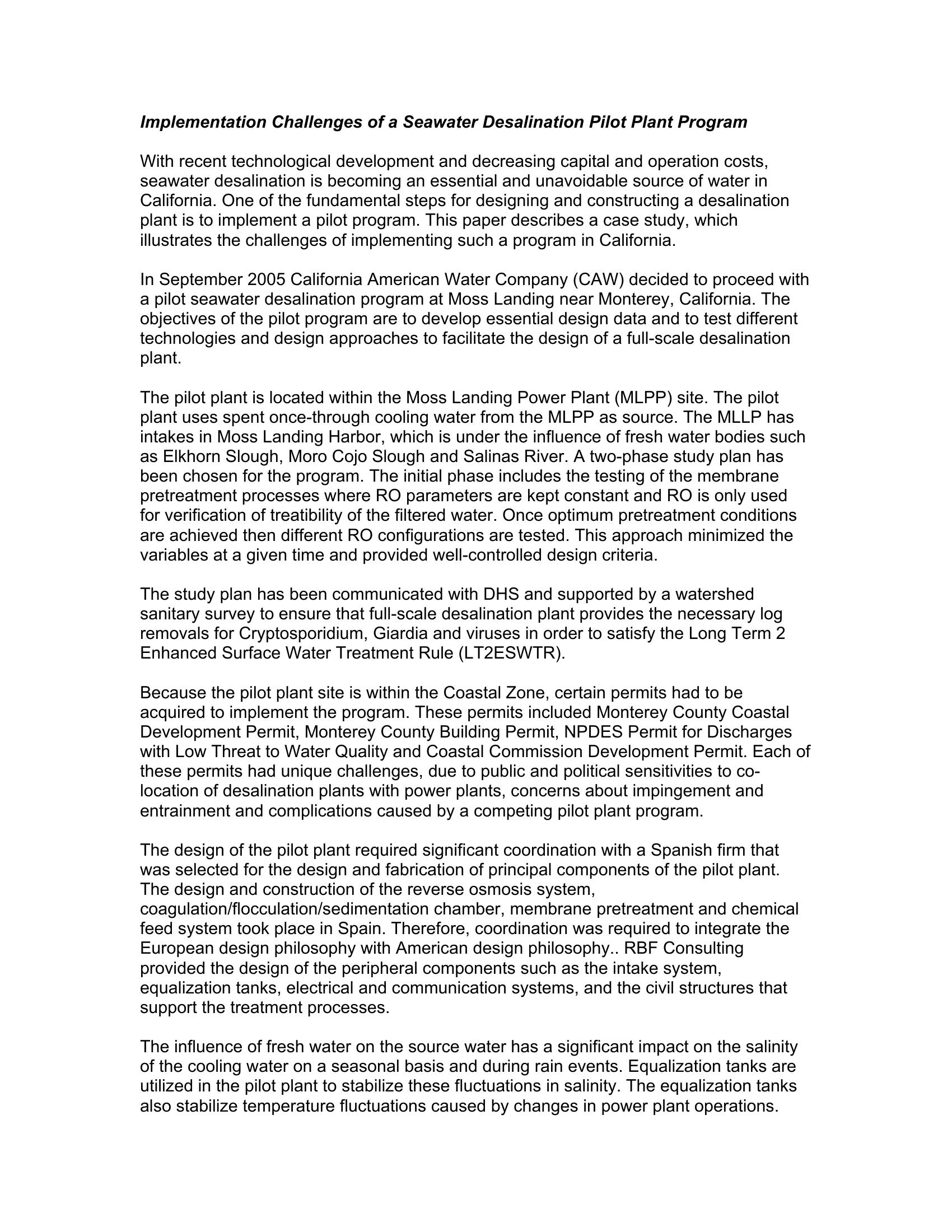 In September 2005 California American Water Company (CAW) decided to proceed with a pilot seawater desalination program at Moss Landing near Monterey, California. The objectives of the pilot program are to develop essential design data and to test different technologies and design approaches to facilitate the design of a full-scale desalination plant.