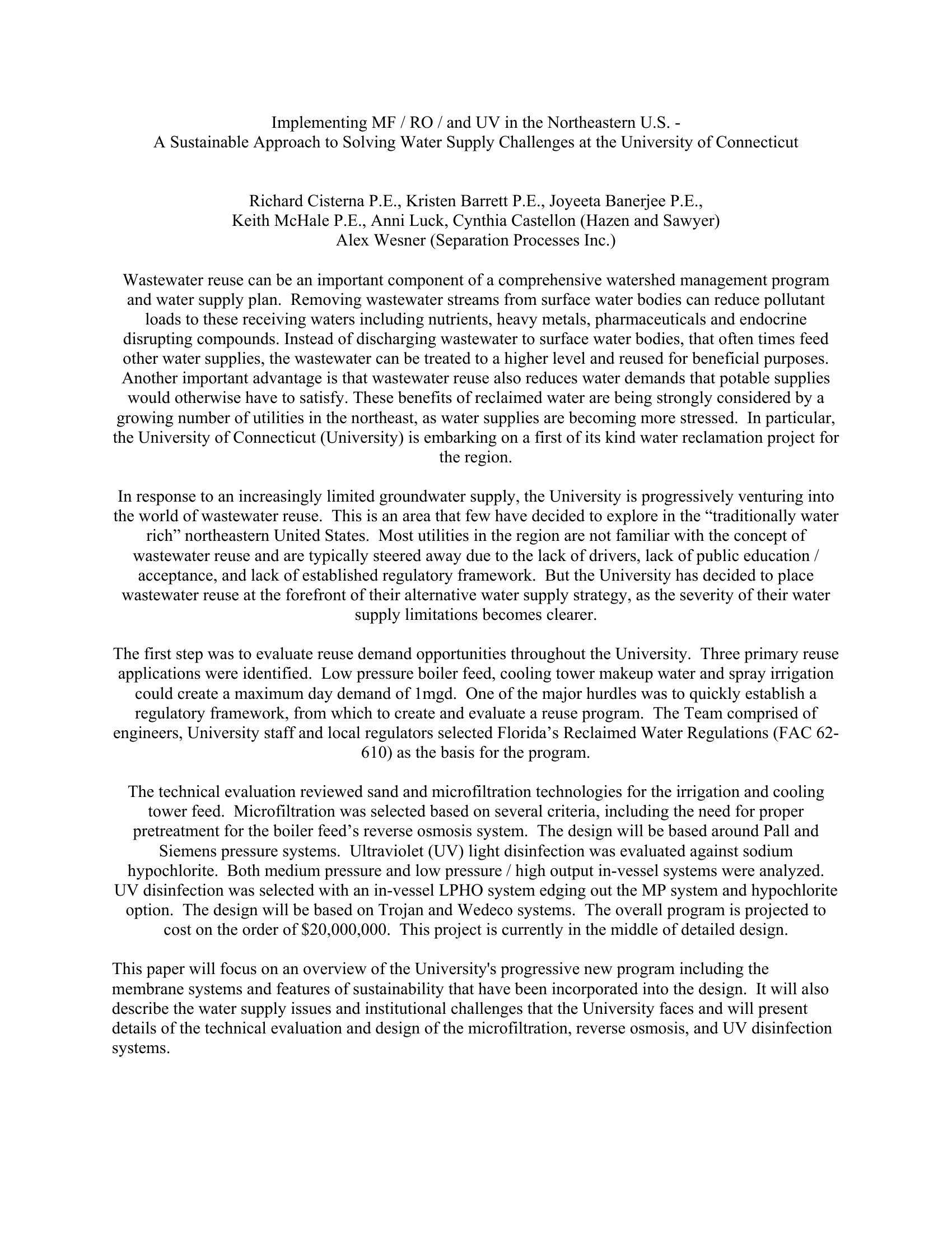 Wastewater reuse has not been explored traditionally in the water rich north eastern US. However, as some utilities are approaching limits of their supply, reuse is becoming a more attractive option for some purposes. Because reuse has not been implemented in this area, the state of Connecticut is relying on reuse guidelines from Florida. One of the biggest hurdles to overcome was finding customers to use the recycled water. The best option was make up water for boilers.