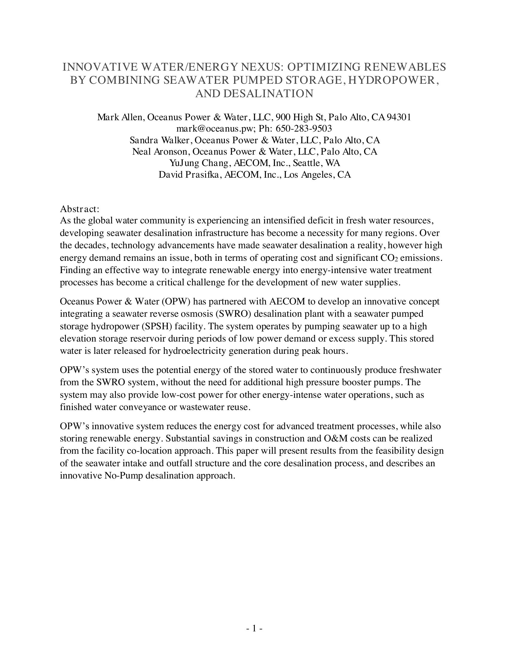 As the global water community is experiencing an intensified deficit in fresh water resources, developing seawater desalination infrastructure has become a necessity for many regions. Over the decades, technology advancements have made seawater desalination a reality, however high energy demand remains an issue, both in terms of operating cost and significant CO2 emissions. Finding an effective way to integrate renewable energy into energy-intensive water treatment processes has become a critical challenge for the development of new water supplies. Oceanus Power & Water (OPW) has partnered with AECOM to develop an innovative concept integrating a seawater reverse osmosis (SWRO) desalination plant with a seawater pumped storage hydropower (SPSH) facility. The system operates by pumping seawater up to a high elevation storage reservoir during periods of low power demand or excess supply. This stored water is later released for hydroelectricity generation during peak hours. OPW’s system uses the potential energy of the stored water to continuously produce freshwater from the SWRO system, without the need for additional high pressure booster pumps. The system may also provide low-cost power for other energy-intense water operations, such as finished water conveyance or wastewater reuse. OPW’s innovative system reduces the energy cost for advanced treatment processes, while also storing renewable energy. Substantial savings in construction and O&M costs can be realized from the facility co-location approach. This paper will present results from the feasibility design of the seawater intake and outfall structure and the core desalination process, and describes an innovative No-Pump desalination approach.
