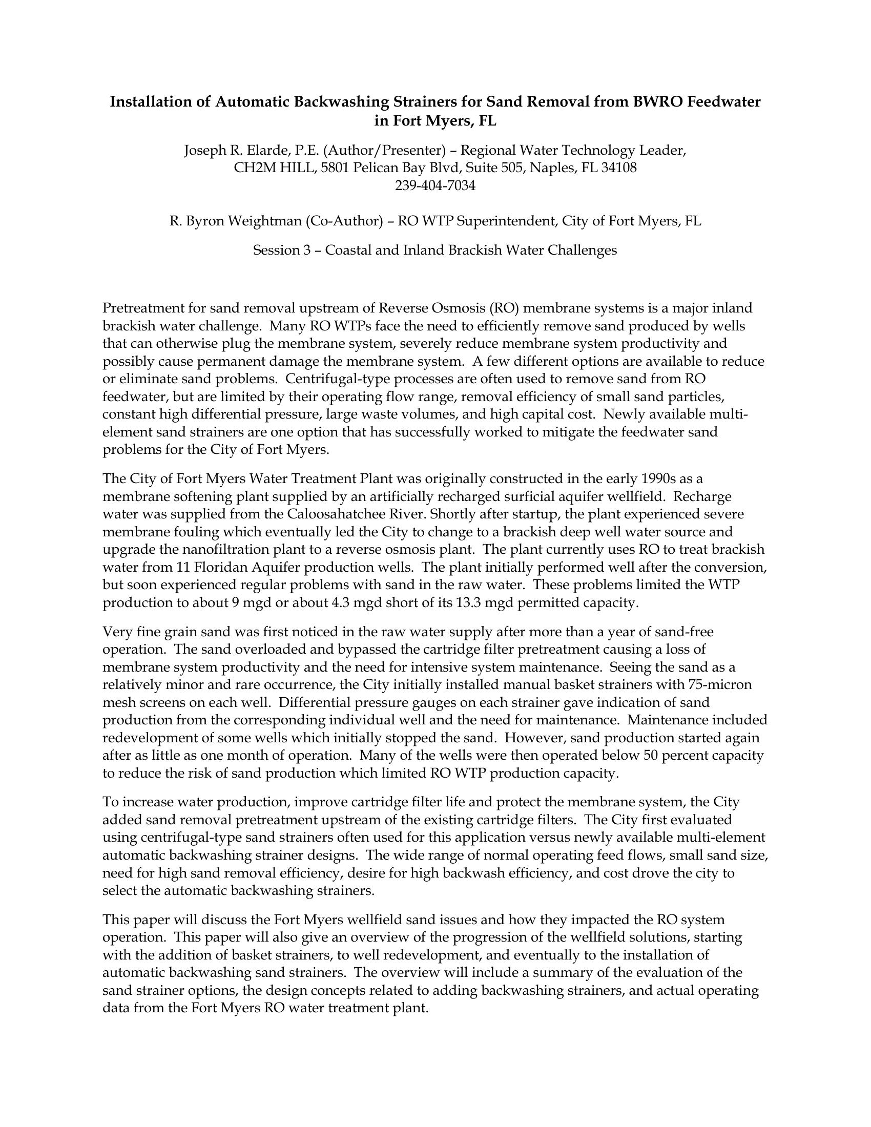 Pretreatment for sand removal upstream of Reverse Osmosis (RO) membrane systems is a major inland brackish water challenge. Many RO water treatment plants (WTP’s) need to efficiently remove sand produced by wells that can otherwise plug the membrane system, severely reduce membrane productivity and possibly cause permanent membrane system damage. A few different options are available to reduce or eliminate sand problems. Centrifugal-type processes are often used to remove sand from RO feedwater, but are limited by their operating flow range, removal efficiency of small sand particles, constant high differential pressure, large waste volumes, and high capital cost. Newly available multielement sand strainers are one option that has successfully worked to mitigate feedwater sand problems. This paper will discuss the City of Fort Myers, Florida wellfield sand issues and how they impacted the RO system operation. This paper will also give an overview of the progression of the wellfield solutions, starting with the addition of basket strainers, to well redevelopment, and eventually to the installation of automatic backwashing sand strainers. The overview will include a summary of the evaluation of the sand strainer options, the design concepts related to adding backwashing strainers, and actual operating data from the Fort Myers RO water treatment plant.