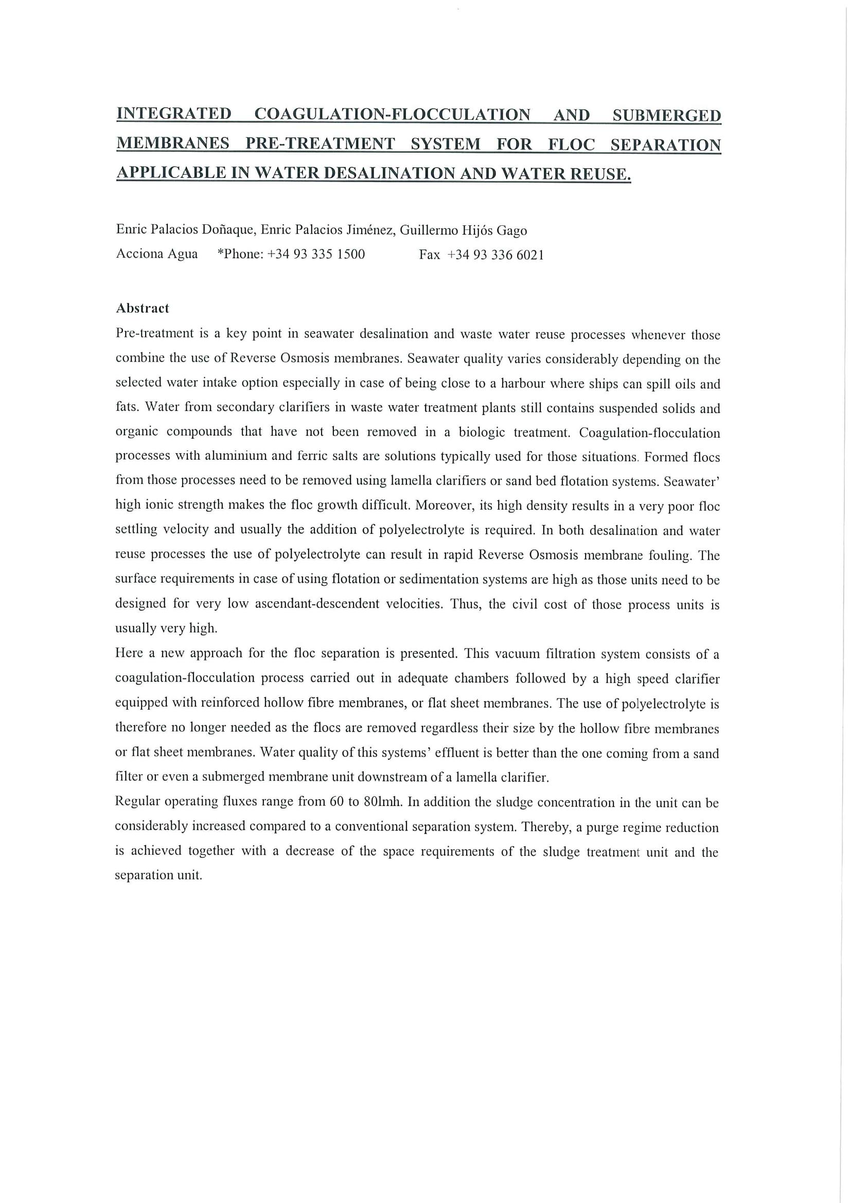 This paper presents an integrated coagulation-flocculation and submerged membranes pretreatment system for floc separationin water desalintaiton and water reuse.