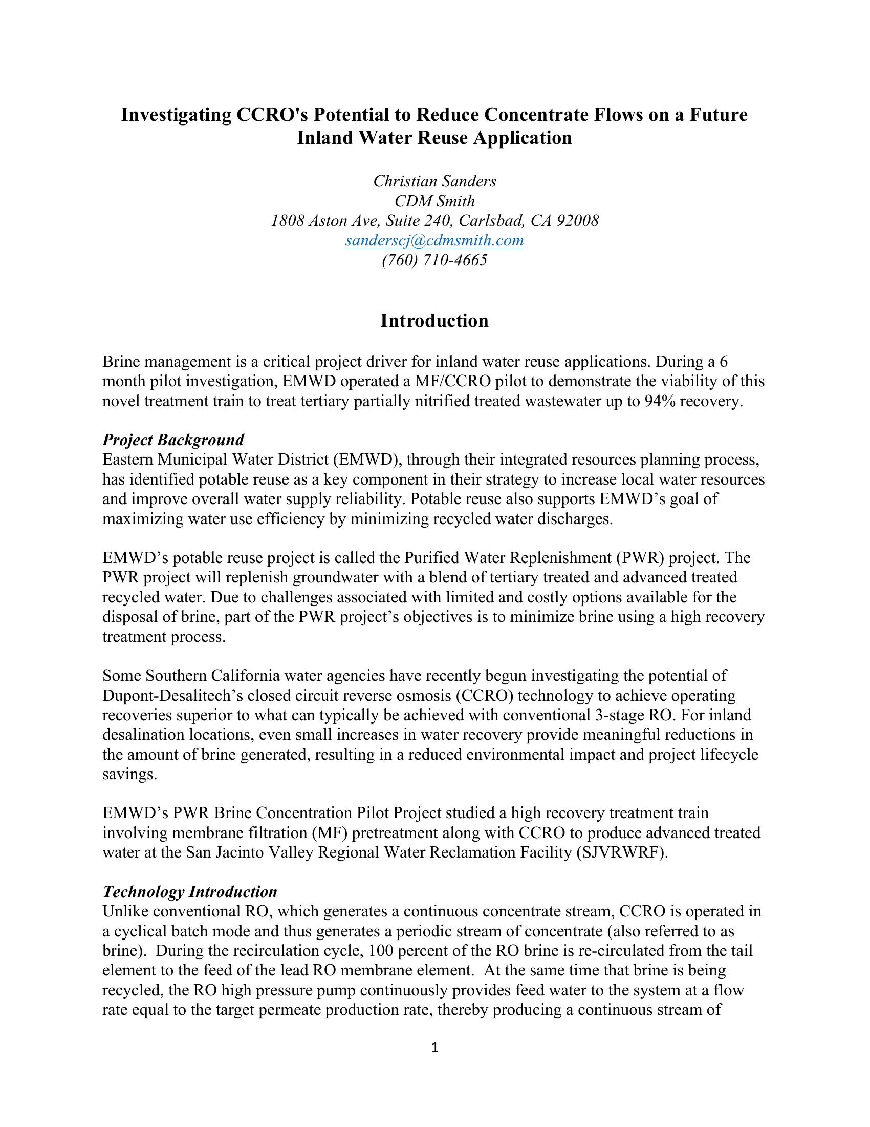 Brine management is a critical project driver for inland water reuse applications. During a 6 month pilot investigation, EMWD operated a MF/CCRO pilot to demonstrate the viability of this novel treatment train to treat tertiary partially nitrified treated wastewater up to 94% recovery.