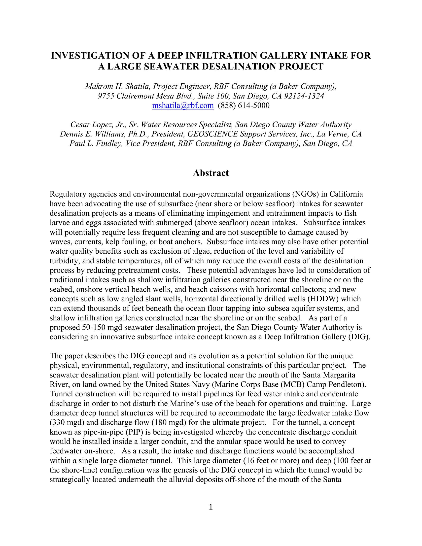 The paper provides design concepts for construction of the tunnel and collector wells, and concludes with a discussion of potential advantages and disadvantages of a DIG intake for this project in comparison to submerged intake, slant wells, or seabed (shallow) infiltration gallery alternatives.