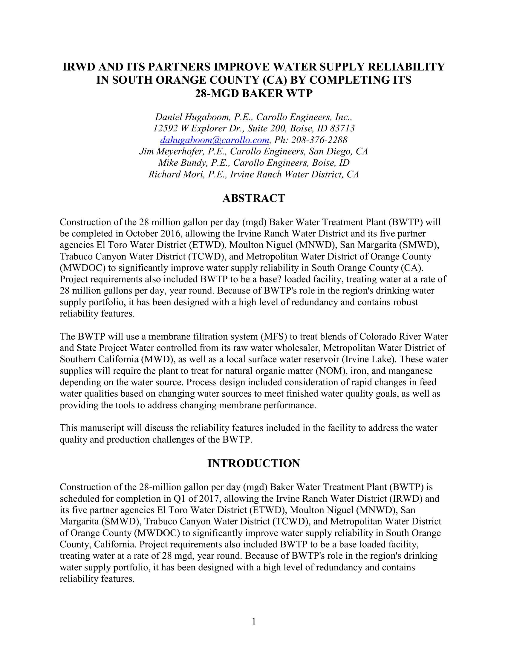 IRWD and its Partners Improve Water Supply Reliability in South Orange County (CA) by Completing its 28-MGD Baker WTP