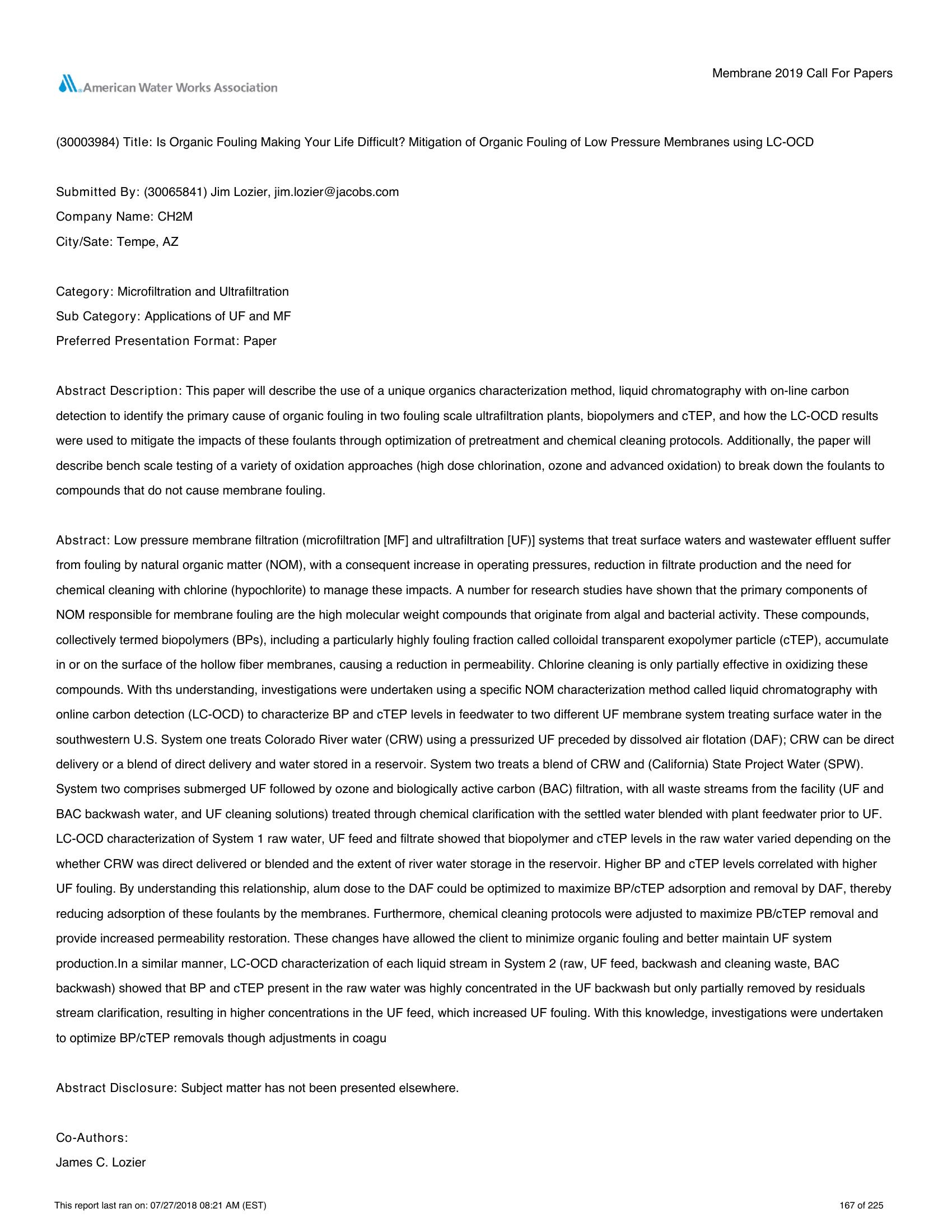 | Keywords | Organic Membrane Fouling, Biopolymers and cTEP |