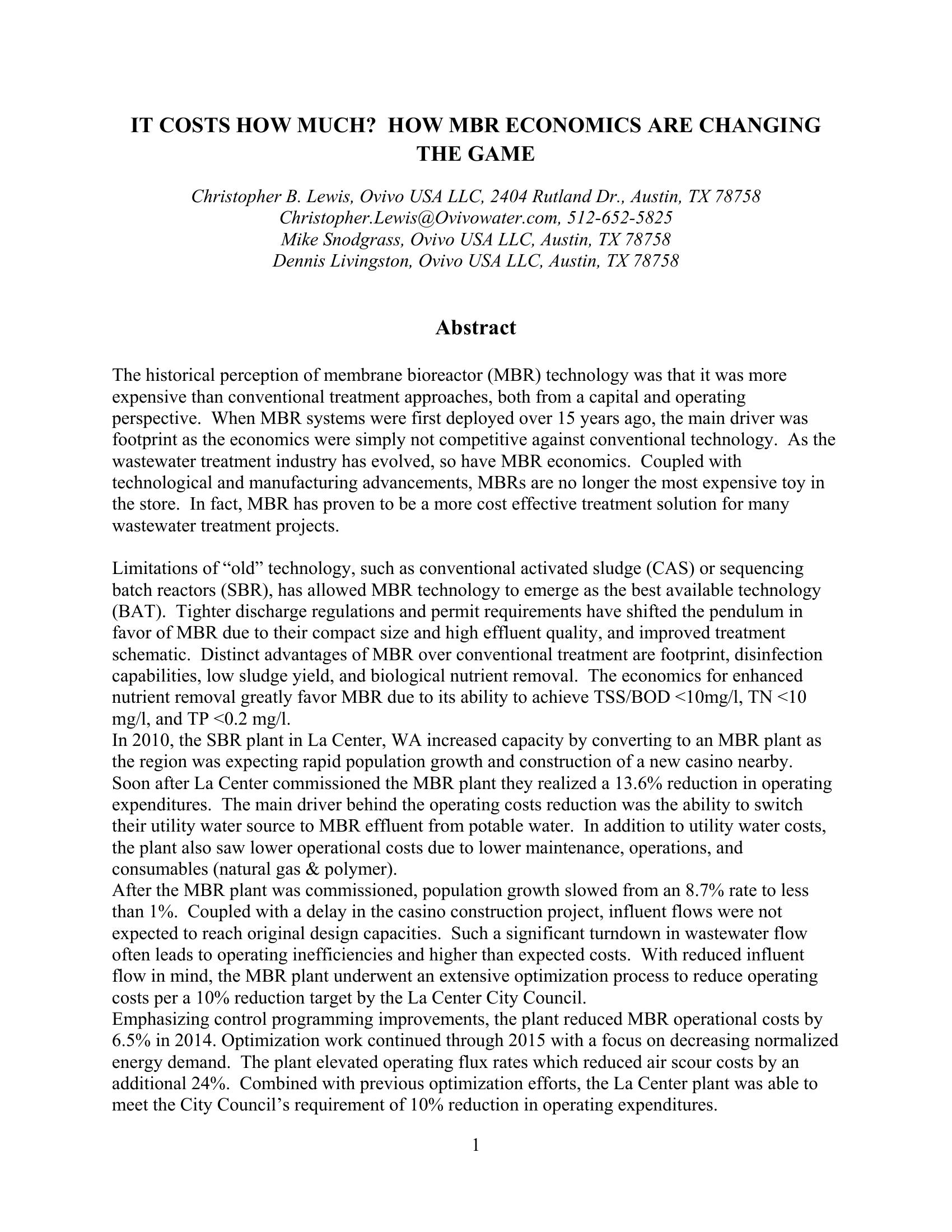 This paper describes the experience of the La Center WWTP plant upgrade to MBR and reinforces the notion that MBR technology is cost competitive with conventional approaches for wastewater treatment. MBR?s higher-than-conventional MLSS concentration presents users with a unique opportunity to substantially reduce biosolids generation. The flexibility to process water on an as-needed basis allows the membrane equipment (associated pumps, blowers, etc.) to operate along their performance curves more efficiently, resulting in much greater energy efficiency. The most clear-cut savings bonanza is the near elimination of potable water usage on site. By reusing high quality MBR effluent (95% reuse for La Center), potable water costs fell to negligible levels