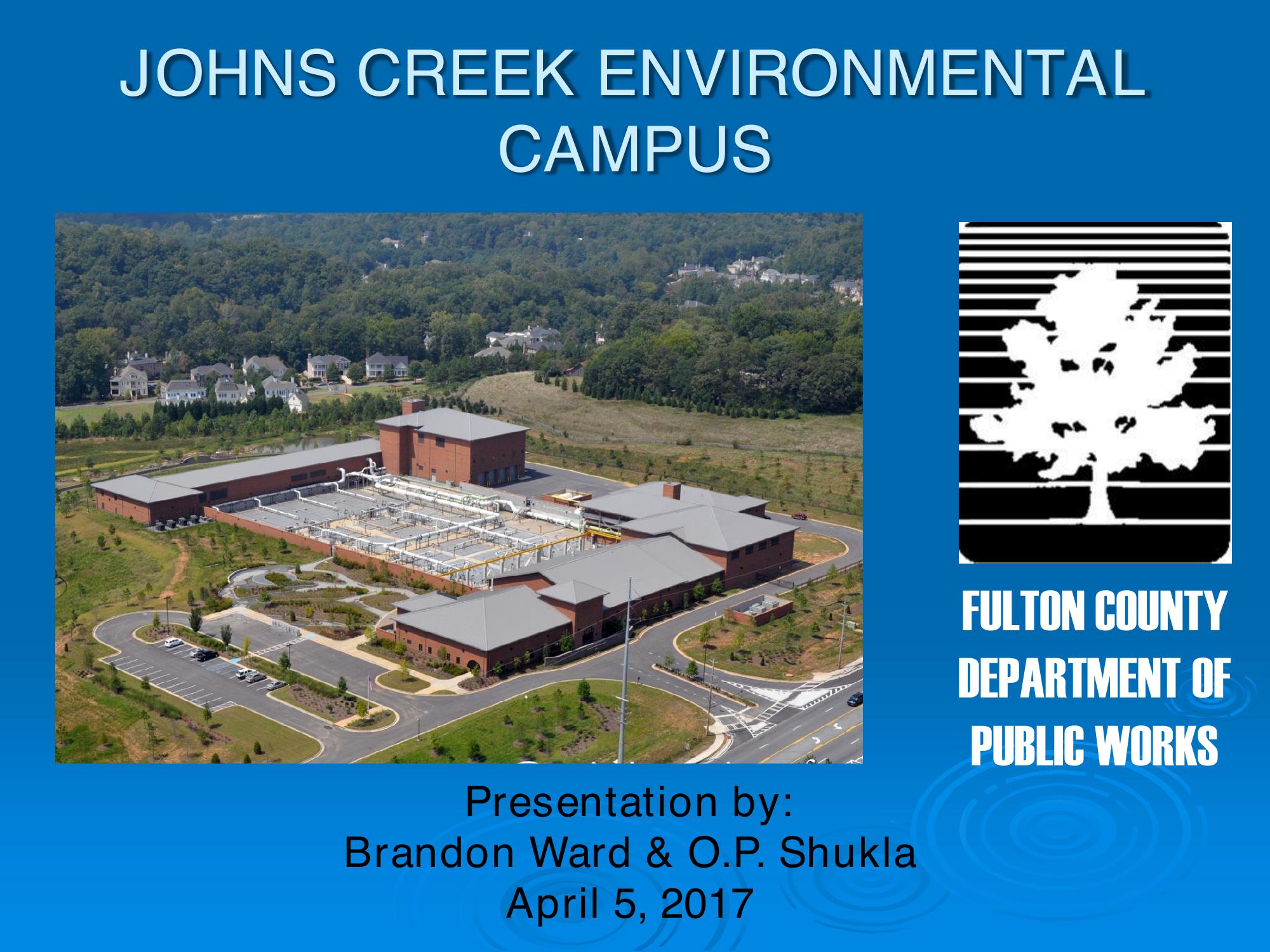 The presentation is intended to provide a brief history and overview of the Johns Creek Environmental Campus prior to a tour of the facility. The topics covered in the presentation will pertain tothe plant’s background, construction, key treatment processes, and “good neighbor” aspects.